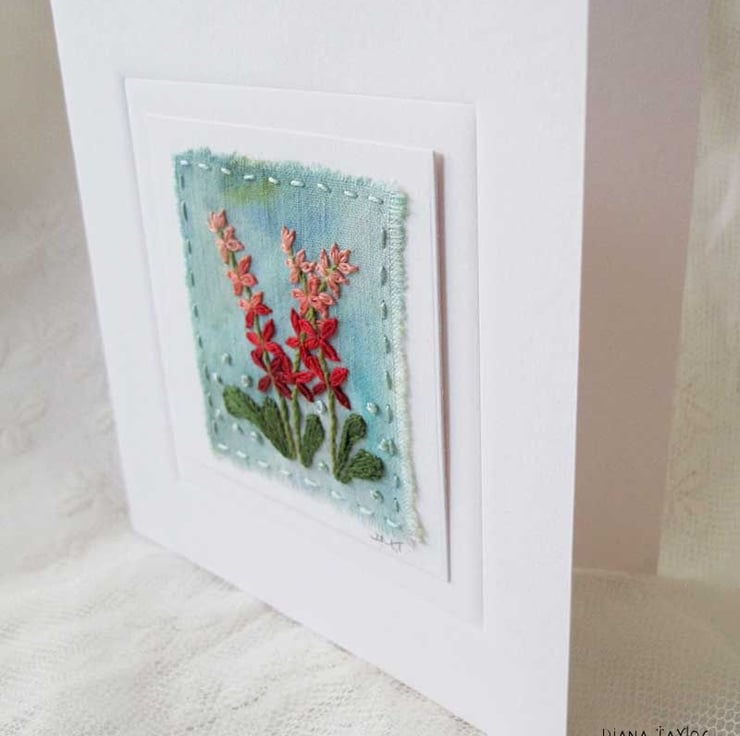 This beautiful card has been embroidered by hand onto fabric that I have dyed in shades of green and turquoise. The design is of stems of flowers ranging in colour from red to coral pink - perfect for a special occasion, or perhaps framing it as it is. It has been mounted on a card base and is surrounded by an embossed square. The card has been left blank for your own message.