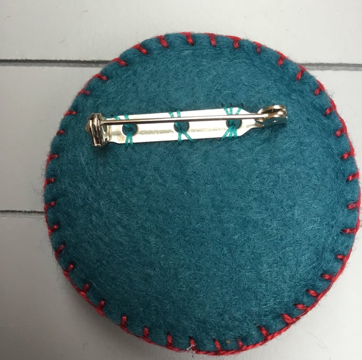 This brooch is 2.50 inches in diameter, a metal bar pin with a safety catch for secure wear is sewn on the back.