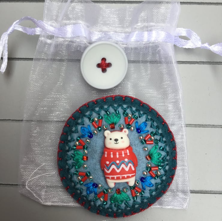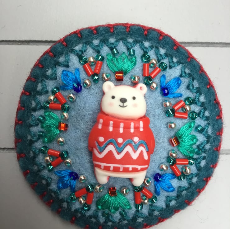 This Hand Embroidered Polar Bear Brooch has a lovely Polar Bear button stitched onto circles of blue felt. She’s wearing a warm red sweater to keep her warm…..The red, blue and white colours of her sweater, are echoed in the hand embroidery and beads that encircle her. Little silver coloured, red, blue and green beads twinkle in the Winter light.