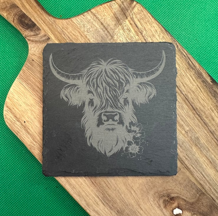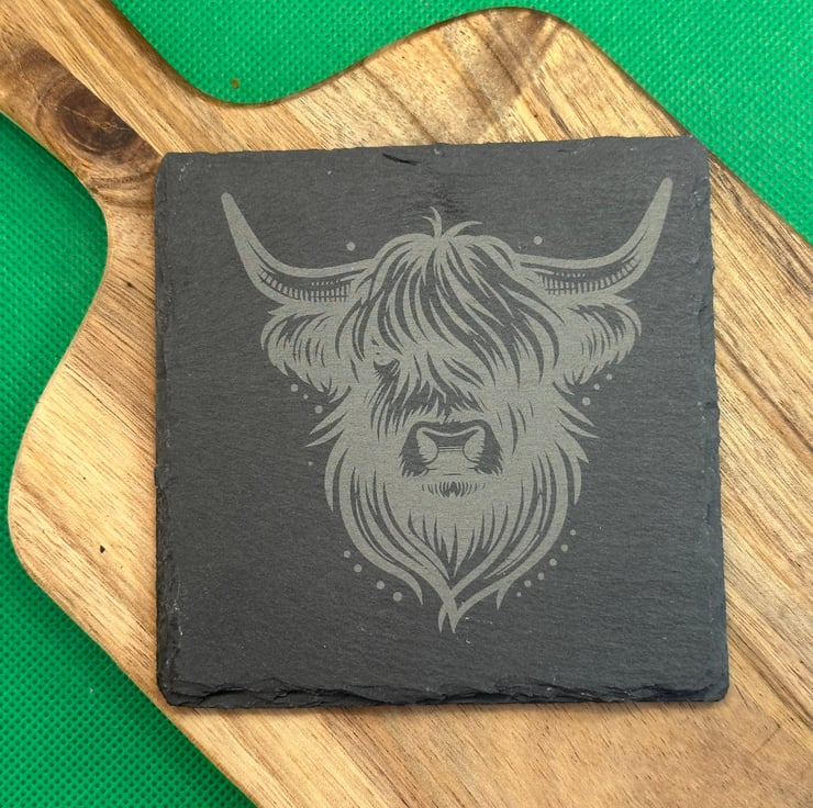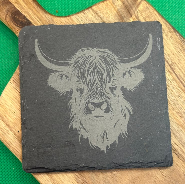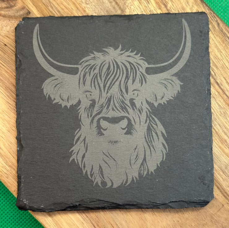 Set of 4 laser engraved natural slate coasters with Highand Cow designs. 100x100mm with protective feet on the rear.