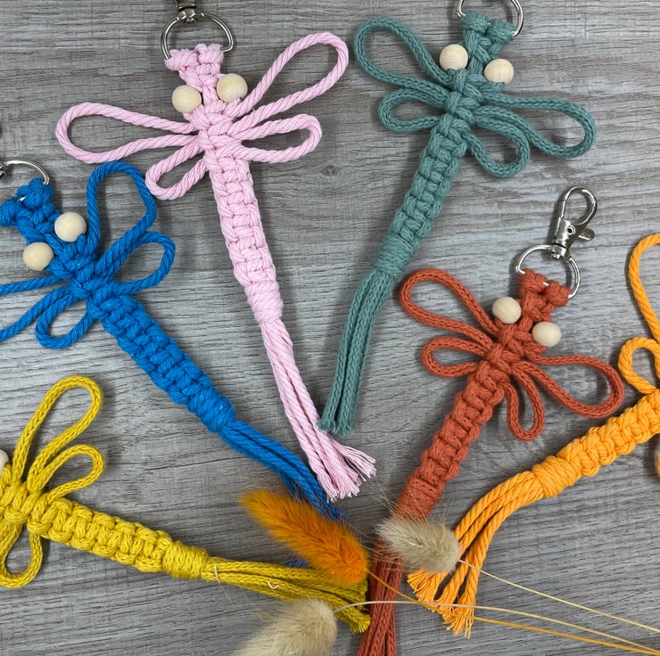 These handmade macrame dragonfly keychains, made from 100% cotton and wooden beads, can be easily added to your bag, keys, purse or anywhere else you wish. Why not add a touch of flair to your accessories!