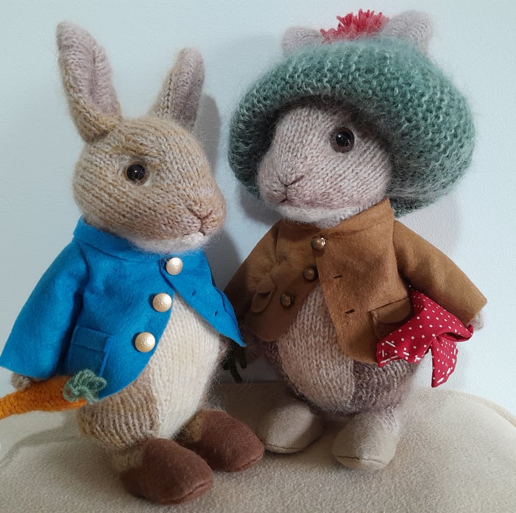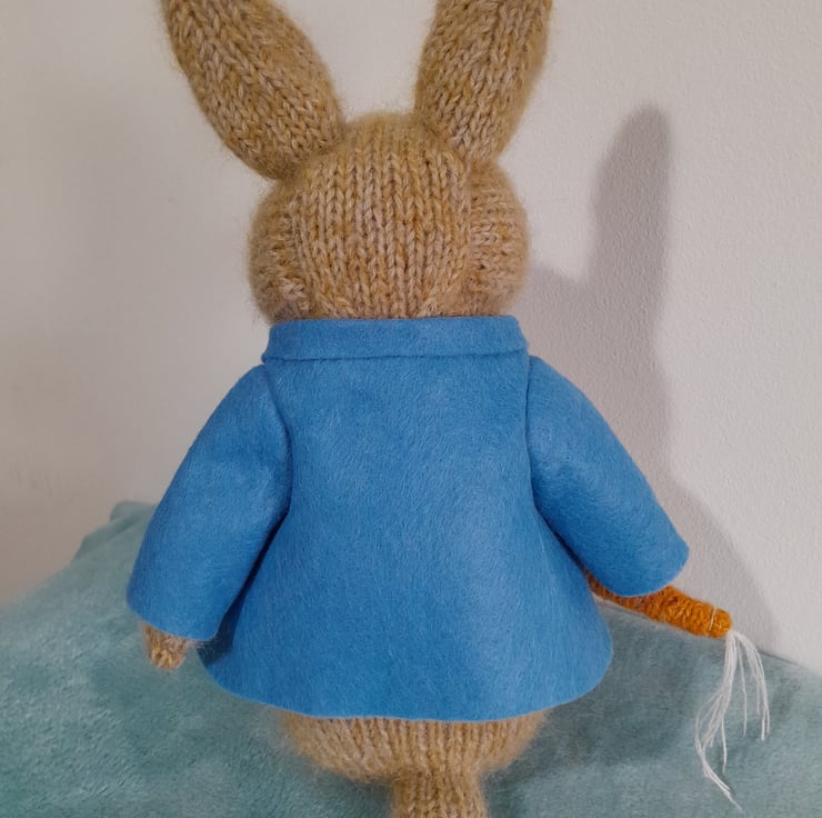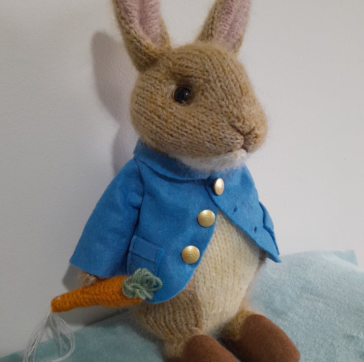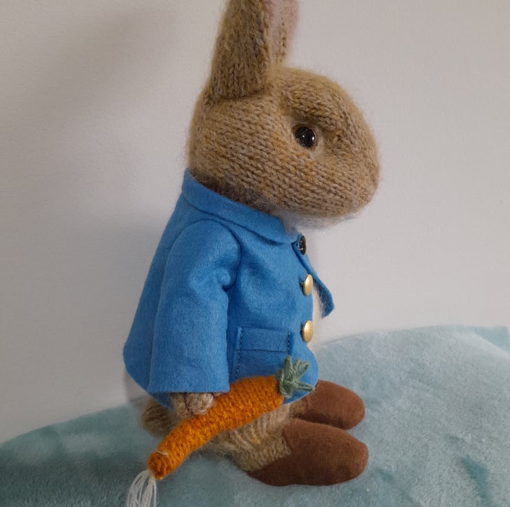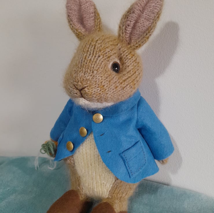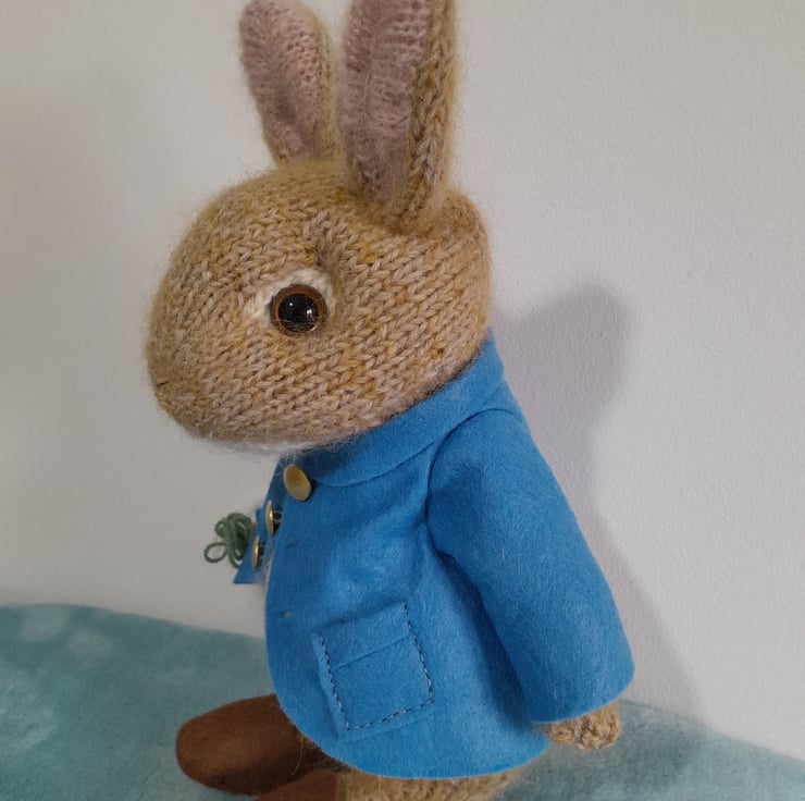 Peter Rabbit is one of the favourite and much loved characters of the Beatrix Potter Books. He is also the best friend of Benjamin Bunny and a lover of radishes and carrots. My peter measures 12" (30cm) from his brown clogs to the tip of his pointy ears. He is knitted in alpaca and mohair yarn and his jacket and clogs are handsewn in wool felt. His clothes are non-removable.