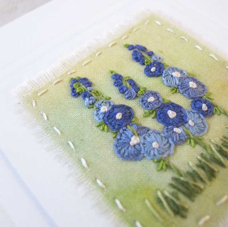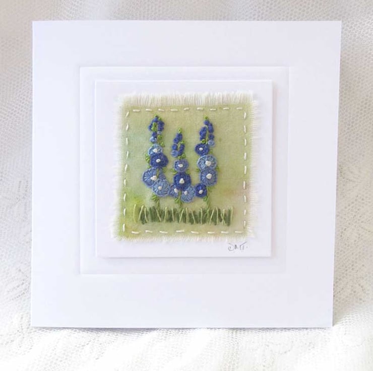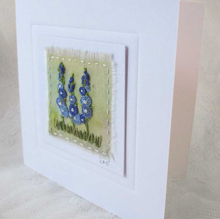 This beautiful card has been embroidered by hand onto fabric that I have dyed in delicate shades of green and yellow. The embroidery design is of Delphinium style flowers in shades of blue - perfect for a special occasion, or perhaps framing it as it is. It has been mounted on a card base and is surrounded by an embossed square. The card has been left blank for your own message.