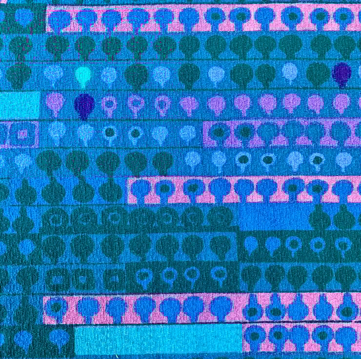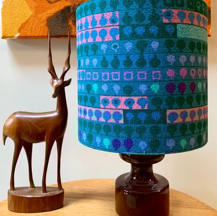 Retro Lampshade in Blue Turquoise Pink Barkcloth Heals Cherry Orchard Vintage fabric . The fabric designer was Irmgard Krebs, circa 1970