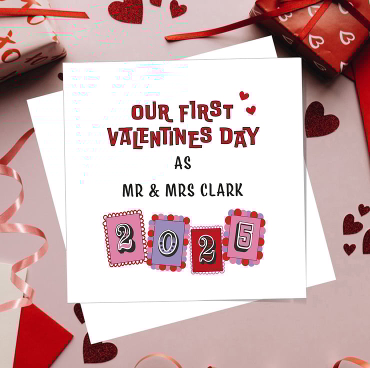 PERSONALISED FIRST VALENTINE’S DAY MARRIED WITH 2 SHIMMER RED HEARTS.