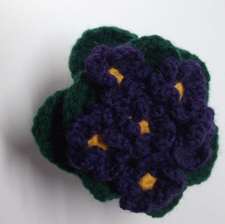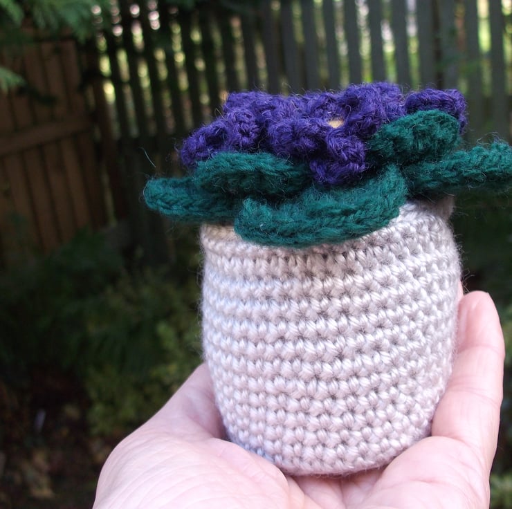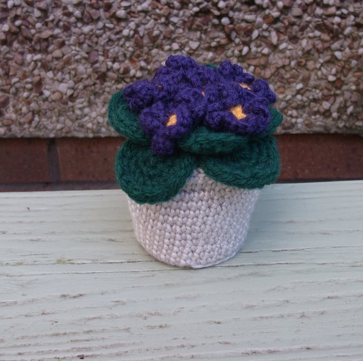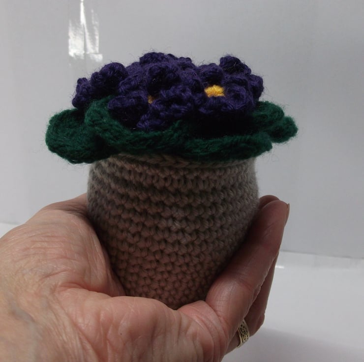 Crocheted pot of violets. Amigurumi potted plant, in a crocheted pot.
