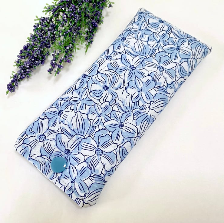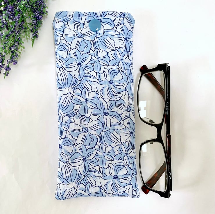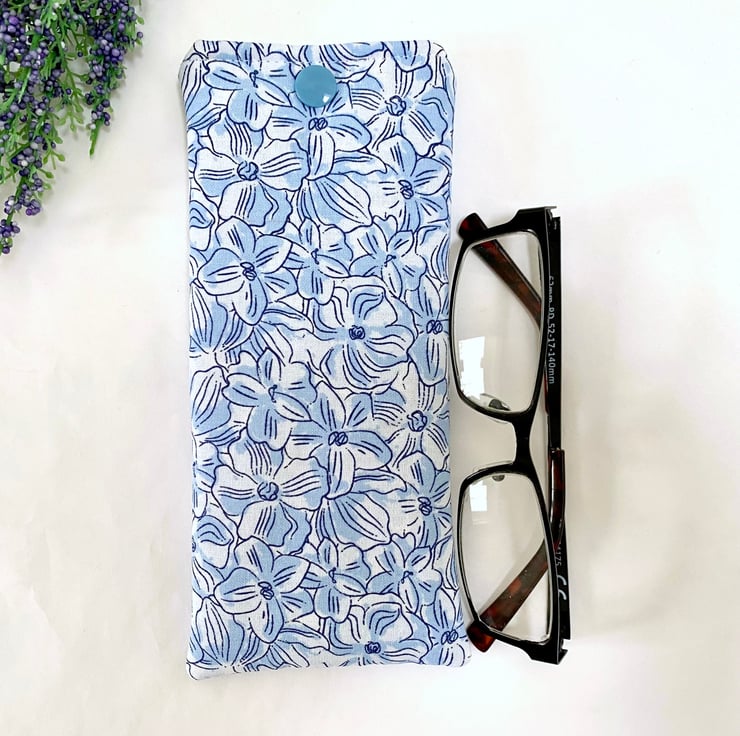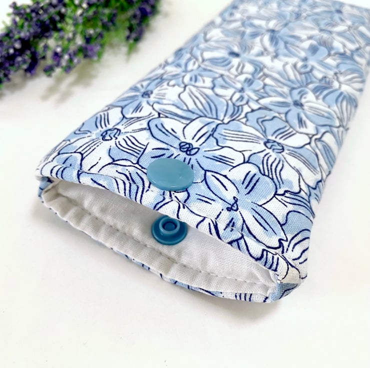 Beautiful cotton viola floral themed fabric with a white lined interior. Padded to add extra protection for your spectacles and a snap fastener to keep your glasses secure when not in use.