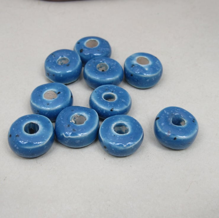They are approx 1.3 cms (0.5") diameter, with a 3mm (0.1") hole but as they are handmade, they are not identical and not perfectly round.