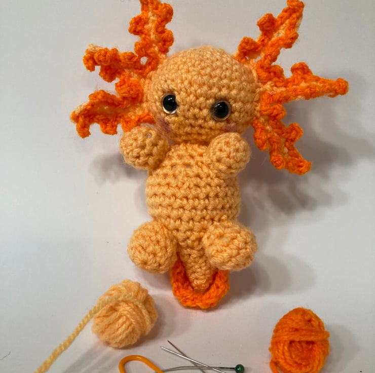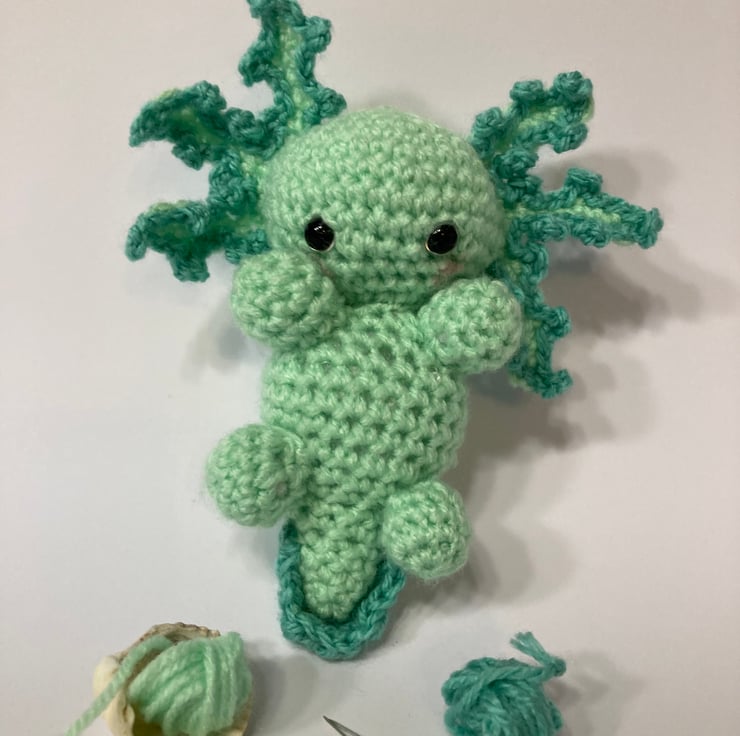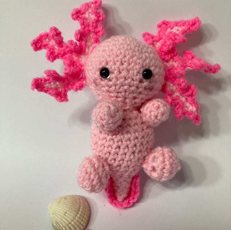 This little axolotl is hand crocheted in complementary colours using James C Brett dk yarn. Stuffed with toy stuffing with cute safety eyes and rosey cheeks. About 10cm tall.