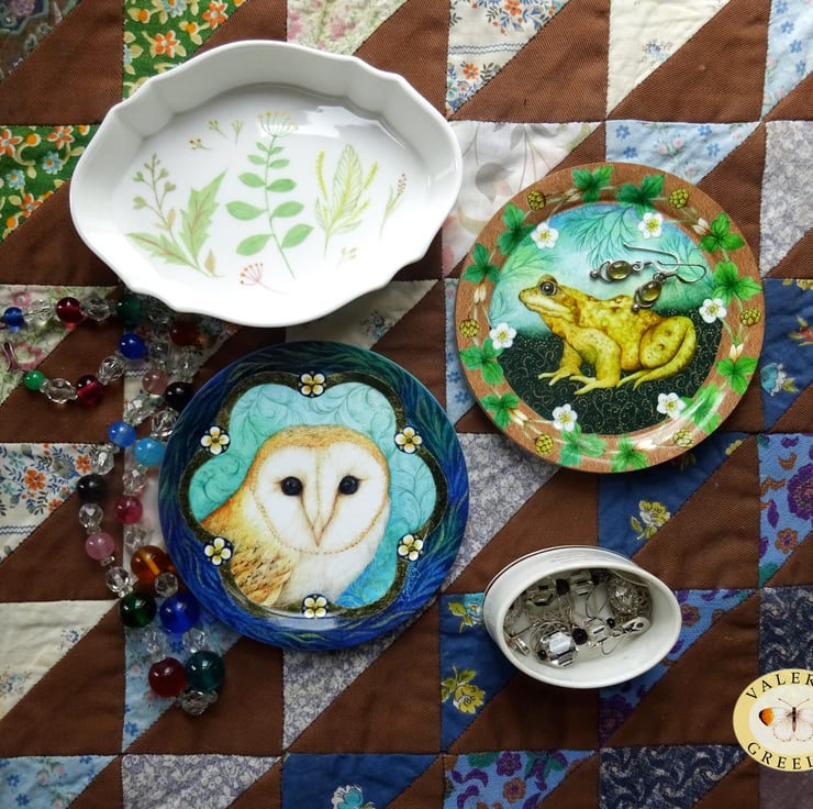 This coaster size, scratch resistant, perspex tray measures four and a quarter ins diameter. It has a shallow lipped edge which makes it ideal for keeping coins, earrings, buttons etc. The design is printed edge to edge. It requires only a surface wipe with a mild soapy damp cloth to keep it looking good. It has been decorated with my barn owl miniature design. It makes an inexpensive but delightful gift.