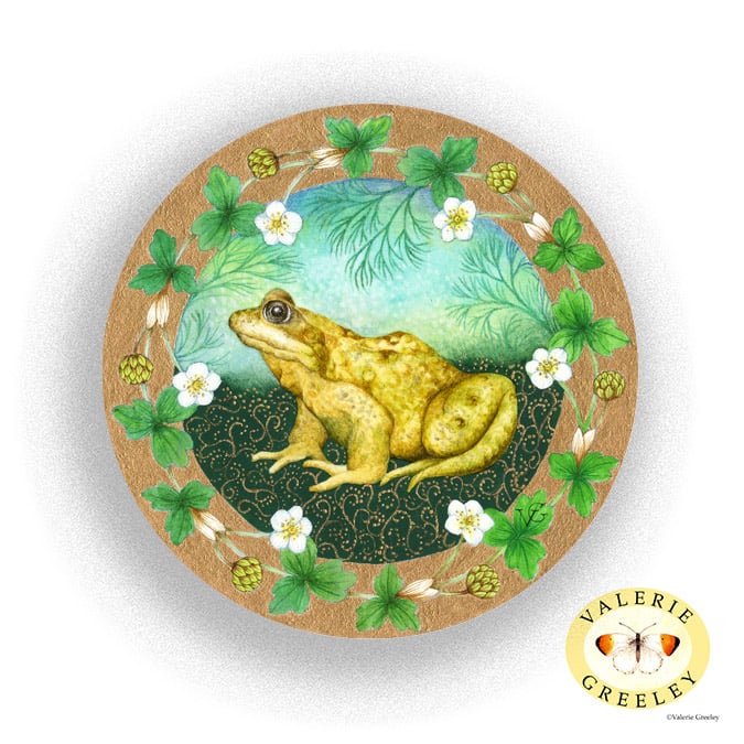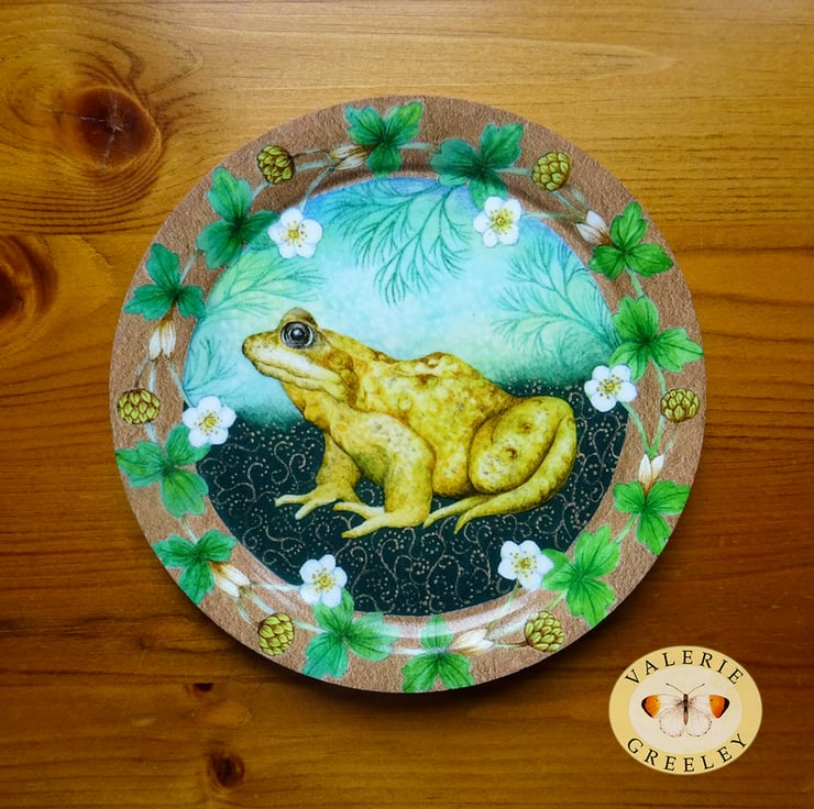 My garden has been home to many frogs over the years. It has also been the home of two frog worrying Jack Russel dogs so it has been important to us to provide a safe dog proof environment for our beloved visitors. I hope we have succeeded ! Over the years the frogs have lived in garden ponds and barrels. We tray to keep the garden semi wild and it is very shady in parts, the frogs seem happy. I painted this miniature frog and save the file digitally, I then created this miniature tray in keeping with the original painting.