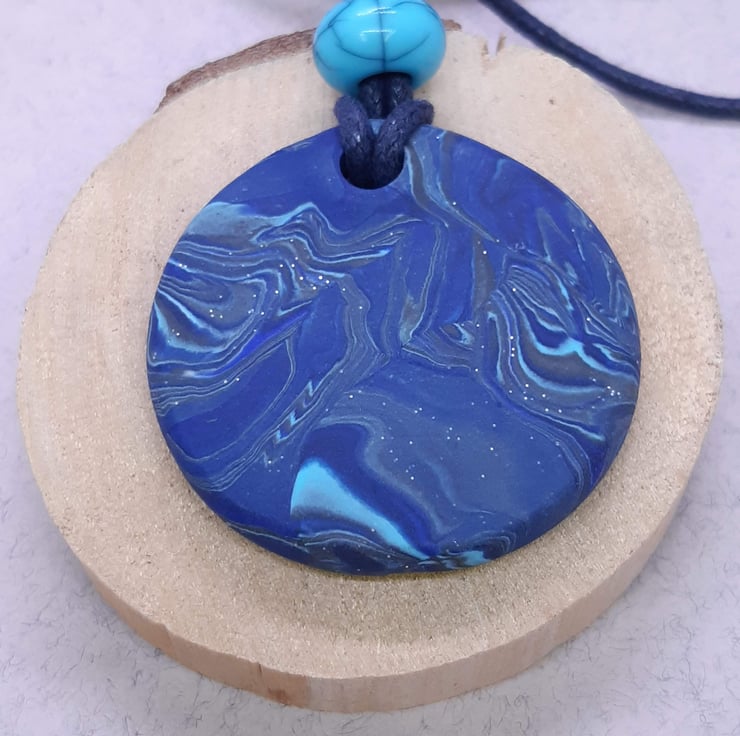 A round polymer clay pendant in a royal blue, sky blue and grey unique swirl design with a hint of sparkle. A turquoise ceramic bead completes the look.
