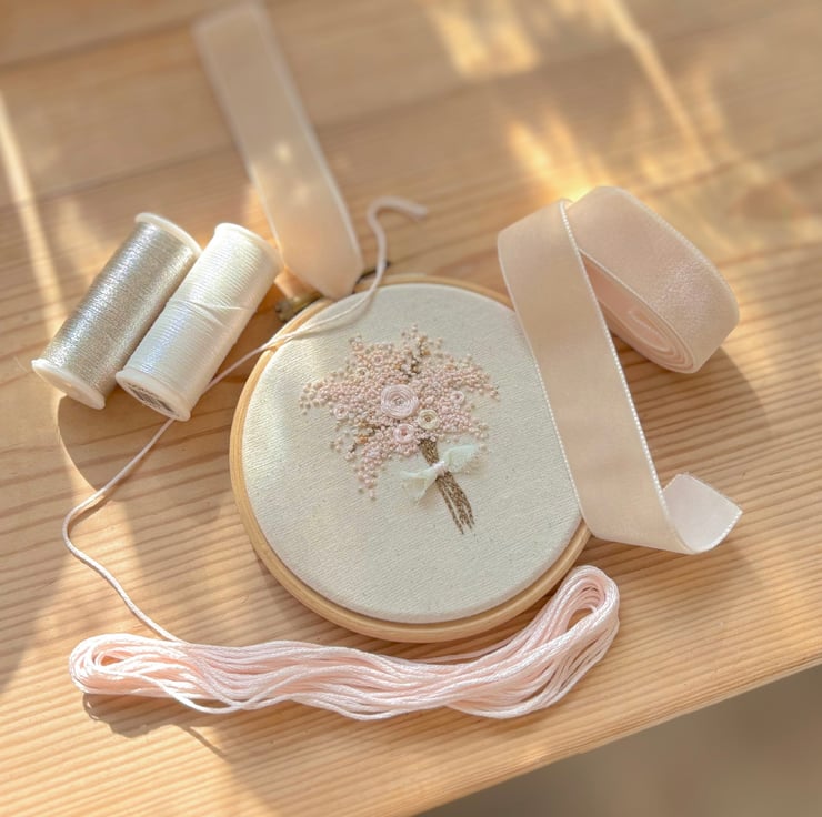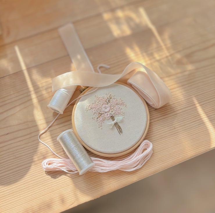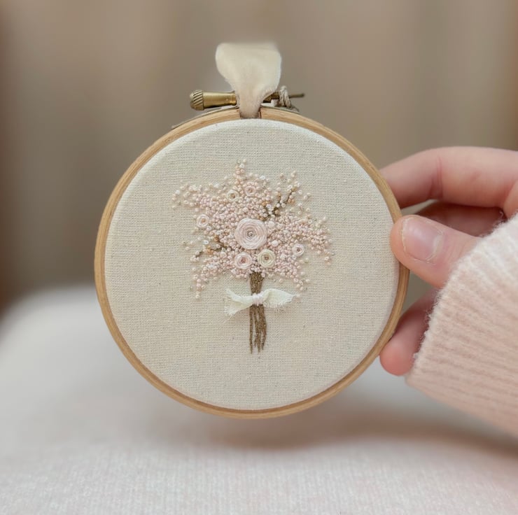 Embroidered floral bouquet wall hanging with white, green, pink and silver accents.
