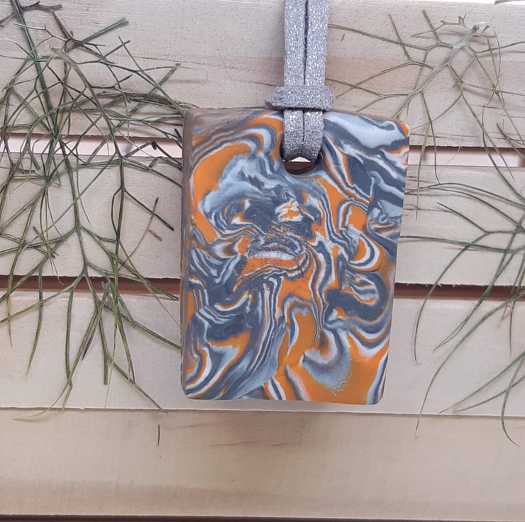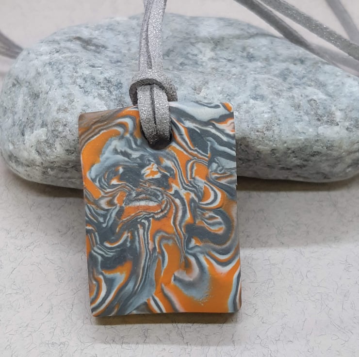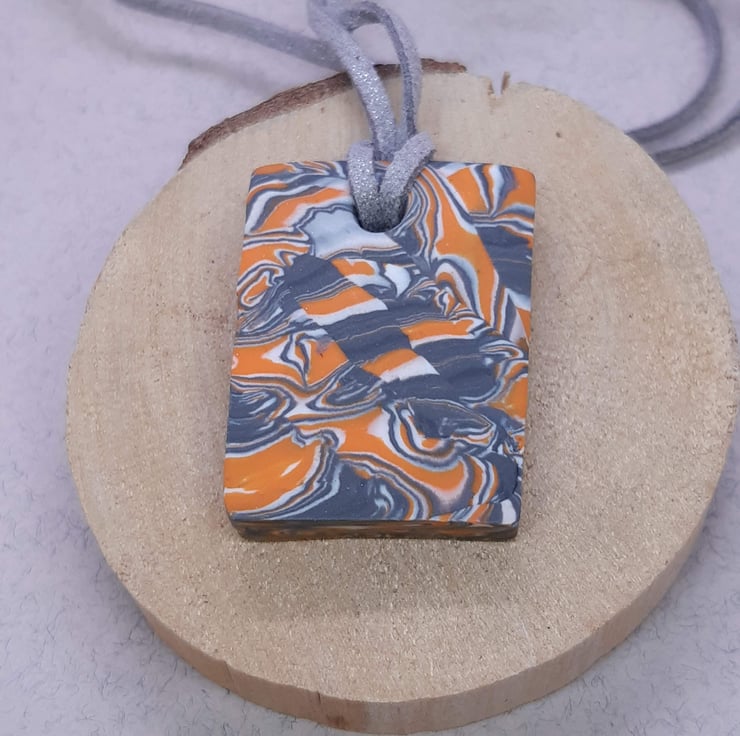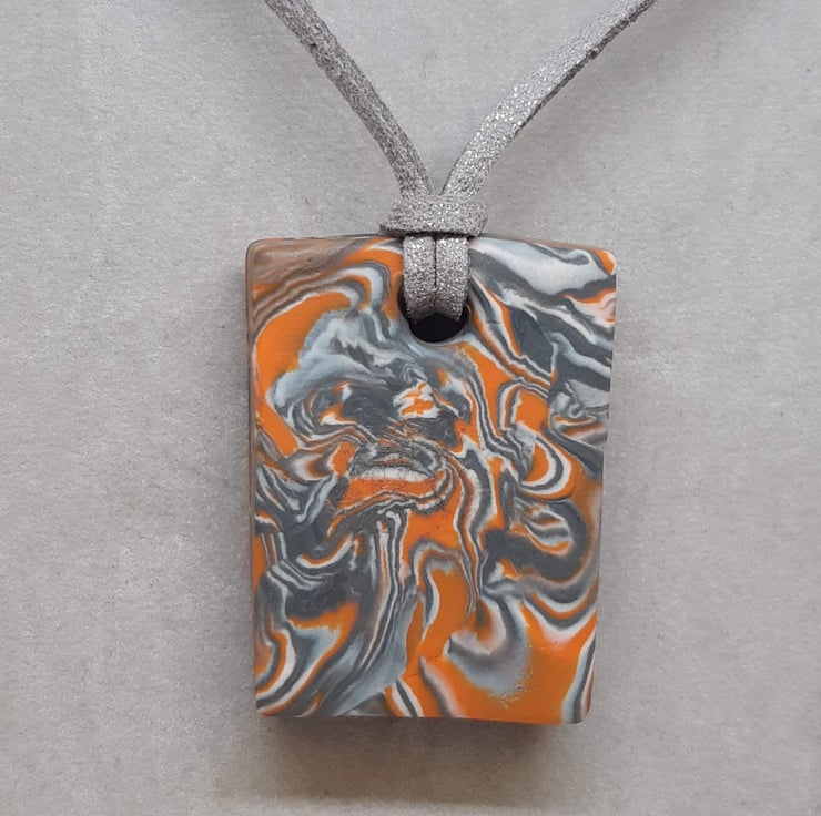 A handmade pendant made from a mix of orange, white and silver polymer clay in a unique swirl design with a hint of sparkle