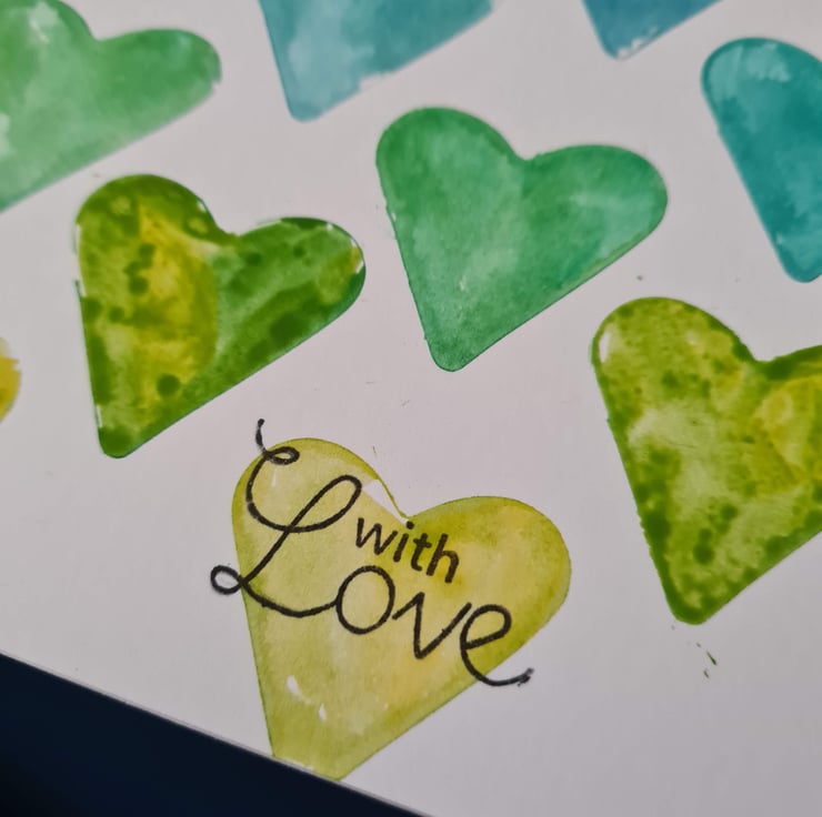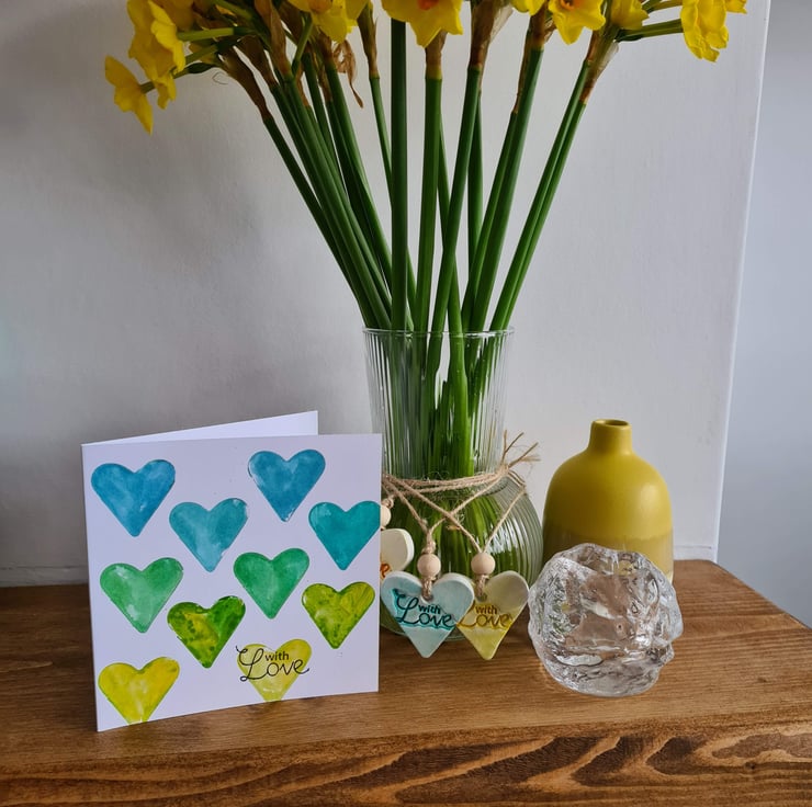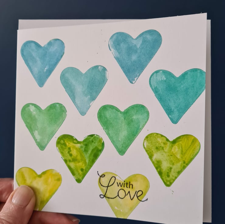 This is a handpainted watercolour card on quality card, which can be used for Valentine's Day, anniversary, engagement or just sending love to someone! Also available are matching clay hanging decorations/gift tags embossed with the words 'with love' - see 'Clay hanging decorations' collection or 'Anniversary cards and tags' collection.