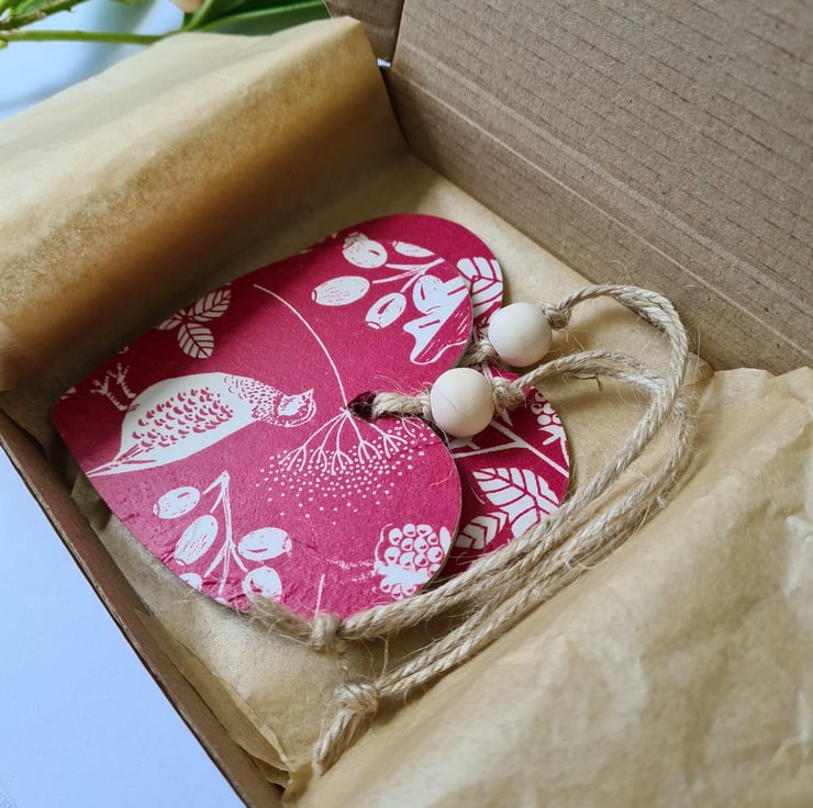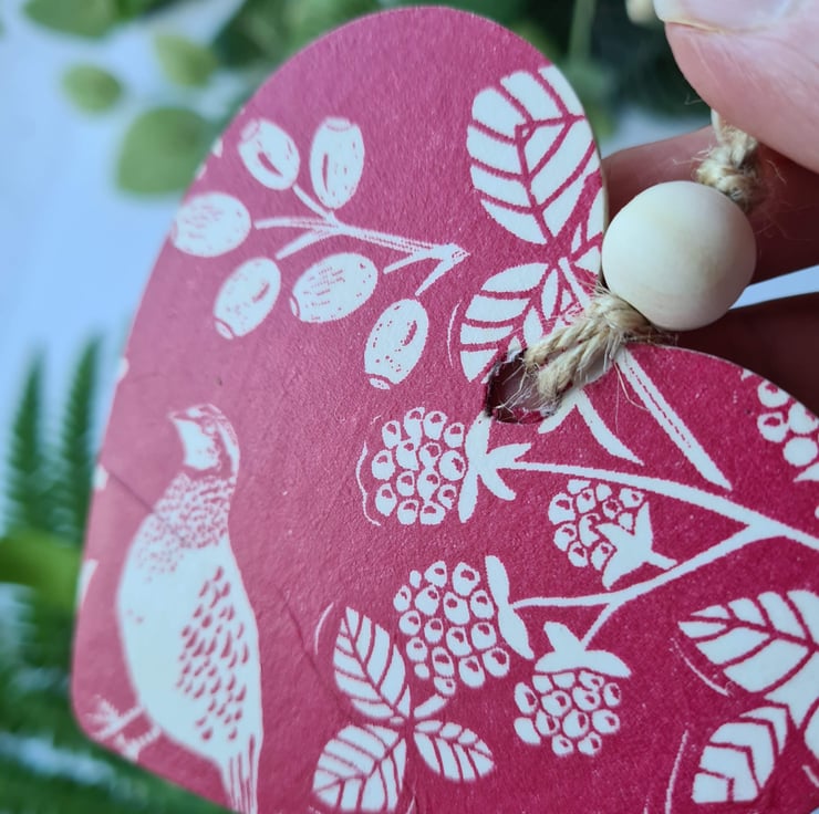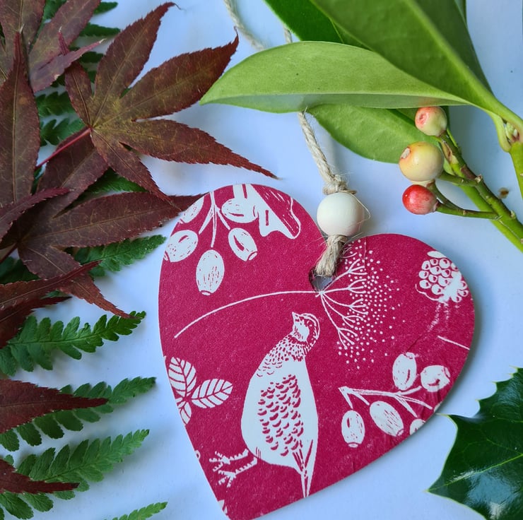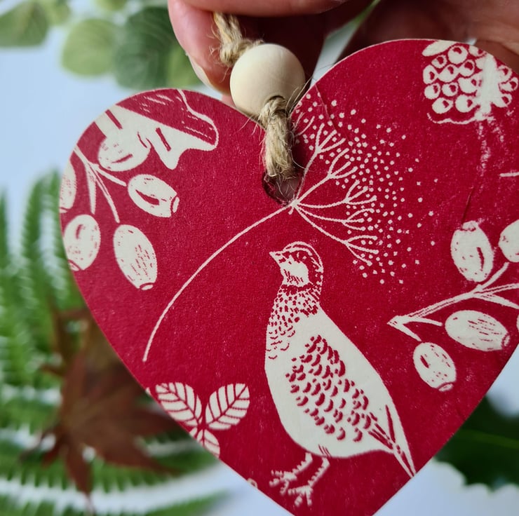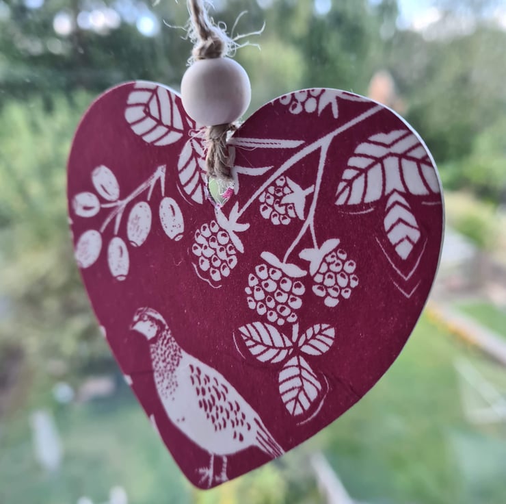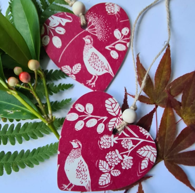 This set of two red wooden decoupage hanging decorations has been decorated in a pretty woodland partridge design which is lovely for Christmas but could also be for autumn display or other times of the year. They have been decorated on one side only, sealed and finished with a bead and jute twine.