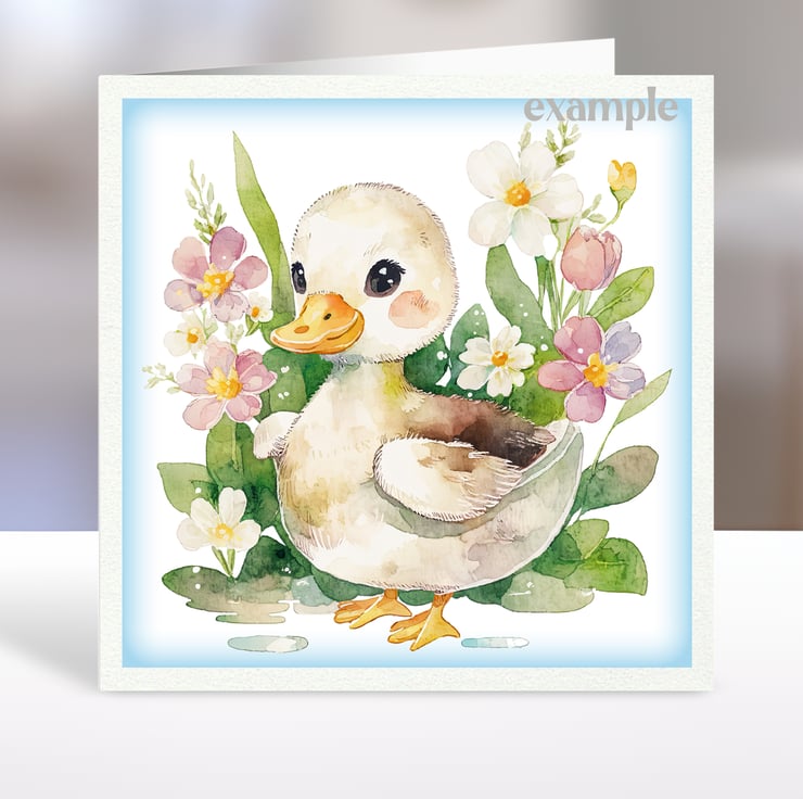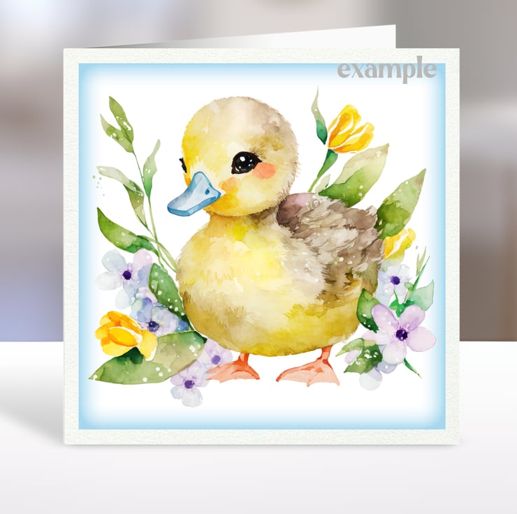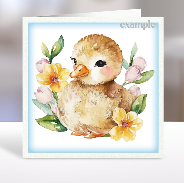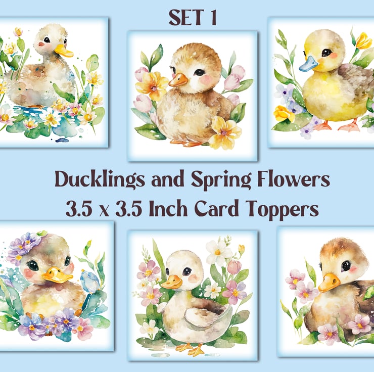 A set of six 3.5 inch square card toppers - ducklings and spring flowers. Set 1 of 2