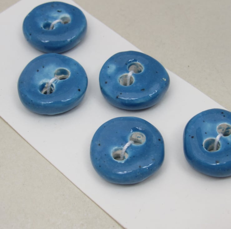 5 small stoneware buttons finished with a lightly speckled cornflower blue glaze.
