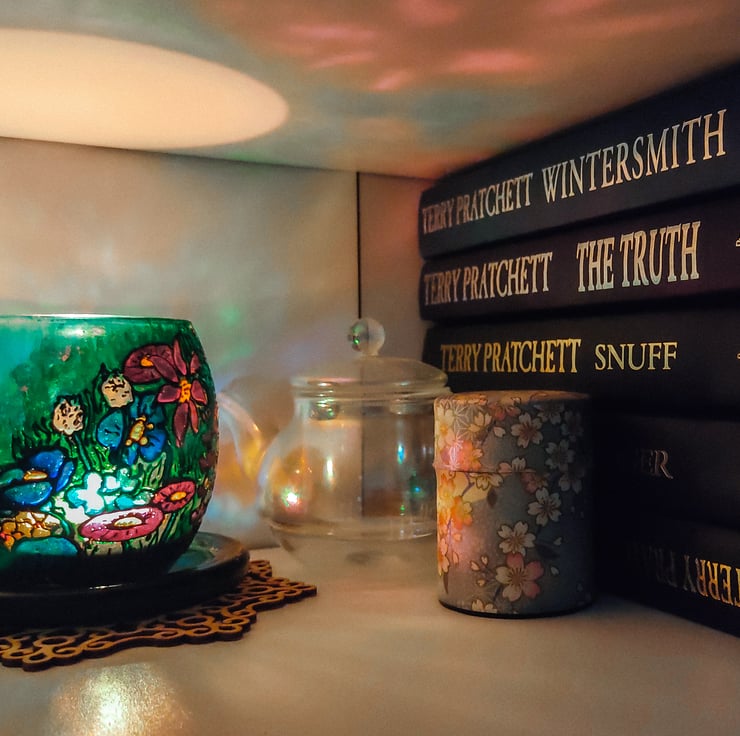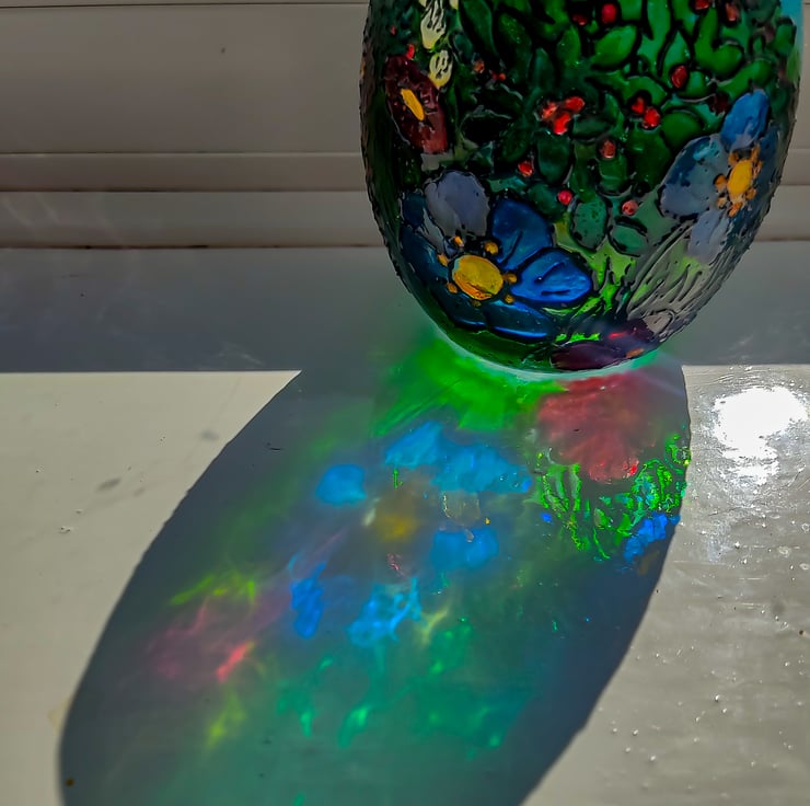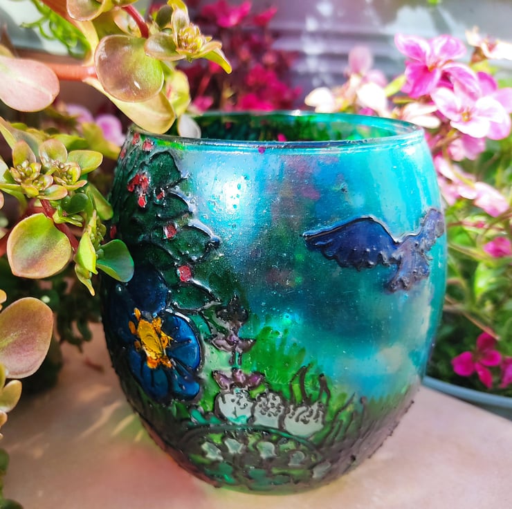 Bring a touch of serenity and charm into your home with this hand-painted tealight holder. Featuring a delicate blue bird soaring above a blooming flower garden, this glass piece doubles as a sun catcher—casting vibrant patterns of light whether it's lit by candlelight or bathed in sunlight. Crafted lovingly by Kat Tofts in Southend-on-Sea, each piece carries a promise of warmth, artistry, and purpose—all profit from each sale is donated to charity.