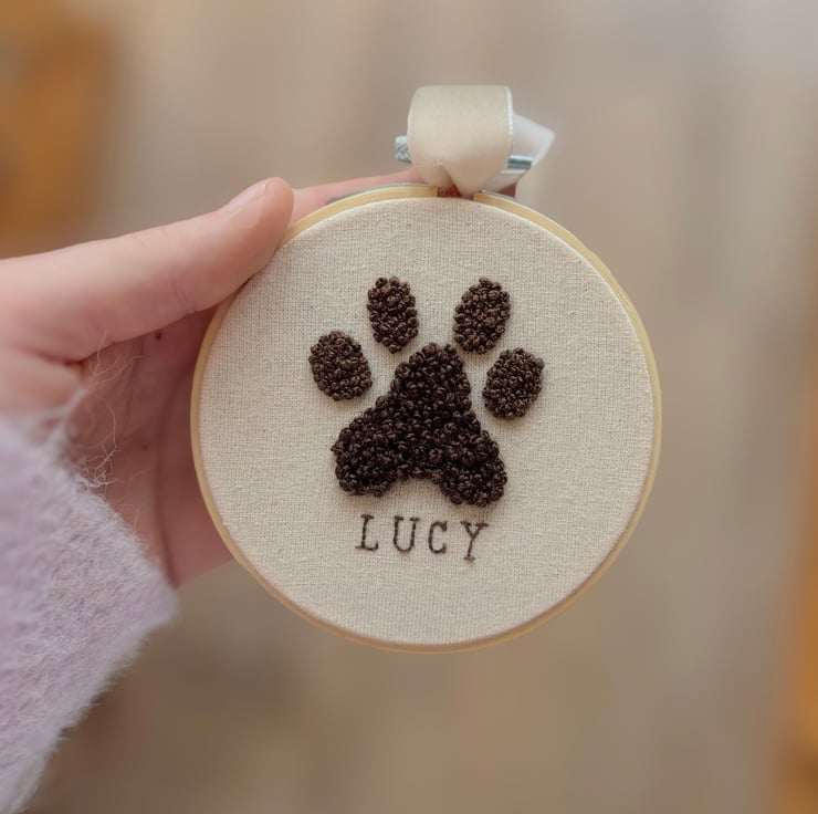A handmade embroidered paw print wall hanging with a personalised name, the perfect addition to help you adorn your space! This is sure to add cuteness to any room. Each piece is designed and handmade individually by me. As each piece is unique, you won’t find another like it!