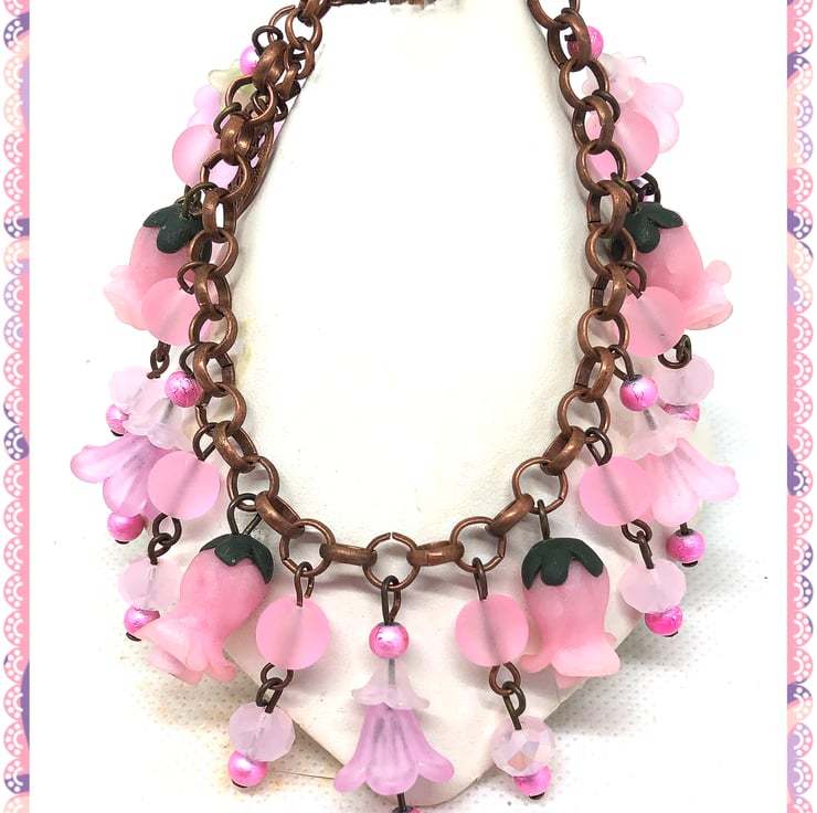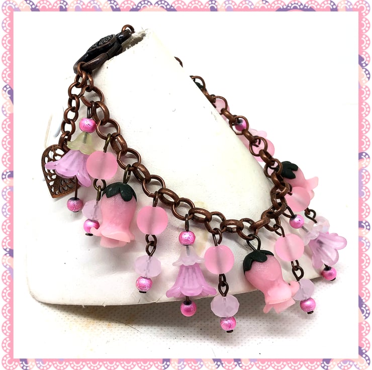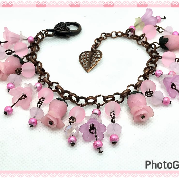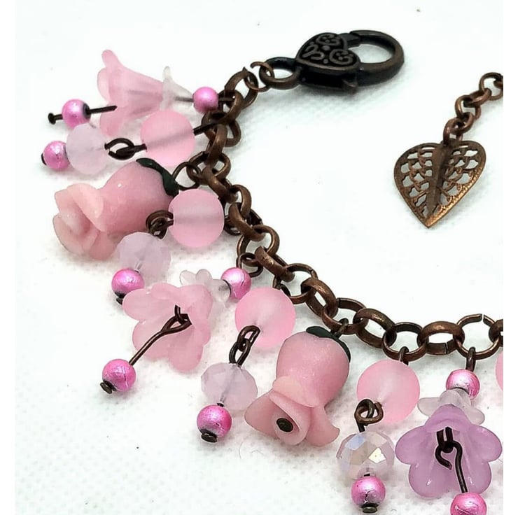 Polymer clay rose bud beads, Lucite flowers, faceted rondels, frosted glass beads, copper findings. Nickel free. Bracelet measures approx 7 1/2”19cm adjustable.Lobster clasp copper rolo chain with extension chain finished with a copper leaf charm. Can be adjusted to suit