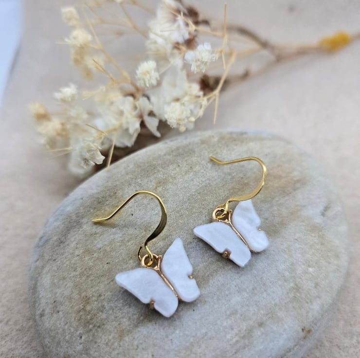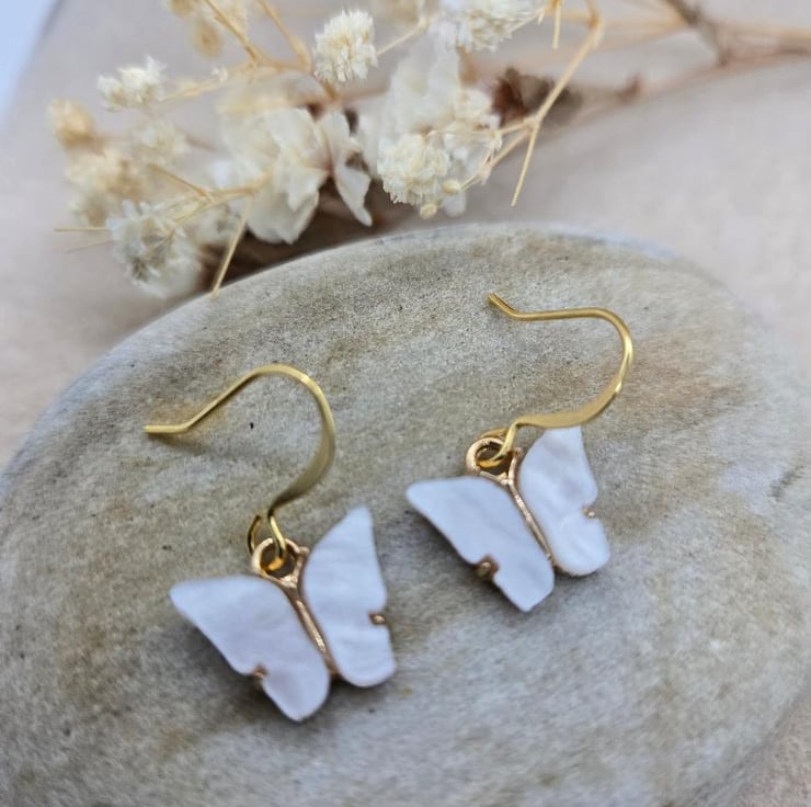 These lovely earrings are handmade with ,Beautiful gold plated hypoallergenic earring hooks and these lovely whimsical white acrylic butterfly charms