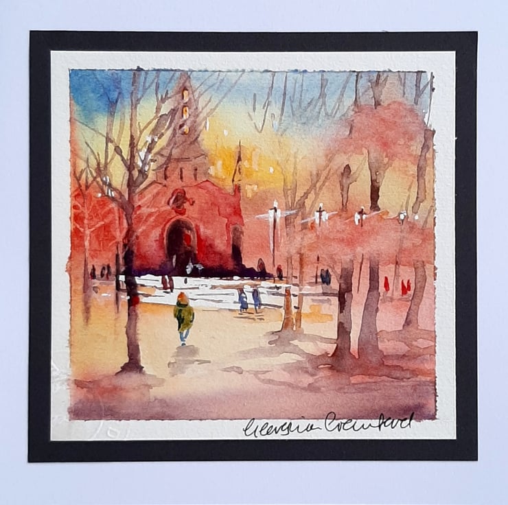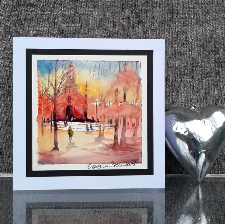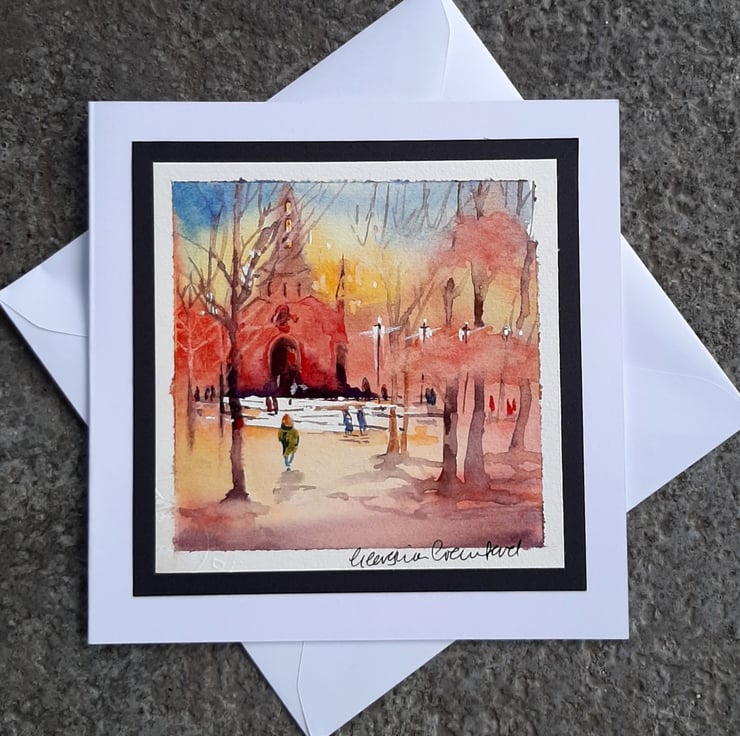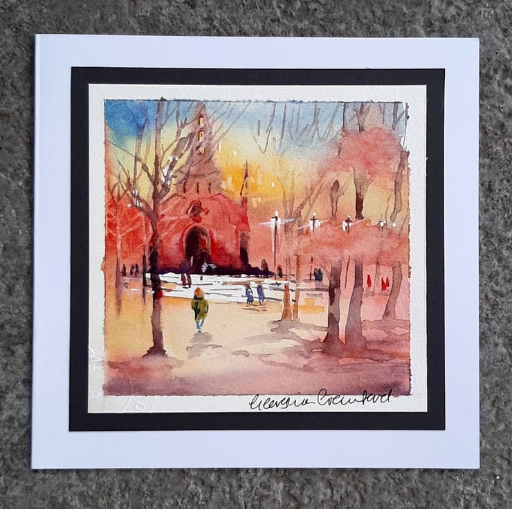 Beautiful handpainted watercolour card of a glowing walk at sunset.