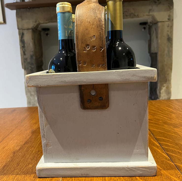 This one takes shabby to a new level. It gives an impression of having been around forever ( a bit like me) Made in the Shed from off cuts of wood, discarded copper pipe and a vintage (1917) leather handle. It is painted in a blue grey shade and carries a cheeky little Yorkshire message in black acrylic.