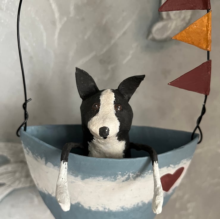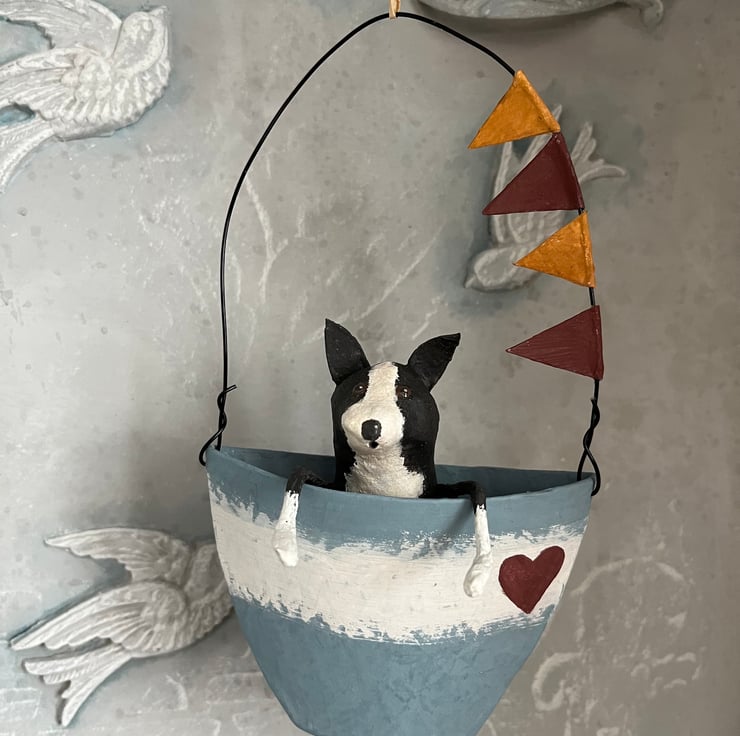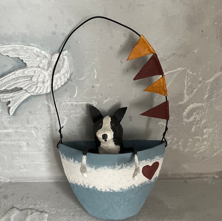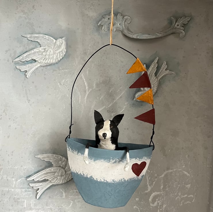 A paper mache collie dog off on an adventure in his bunting-decorated boat. The boat is made from cardboard, then covered in layers of gluey paper - he started off as a lump of tin foil moulded into a basic shape, then refined with masking tape, gluey paper, and cotton wool. The bunting is folded watercolour paper. All these elements are finished with chalk paint and wax. This piece of assemblage art hangs from fine florist wire, and could decorate a wall, drawer or door.