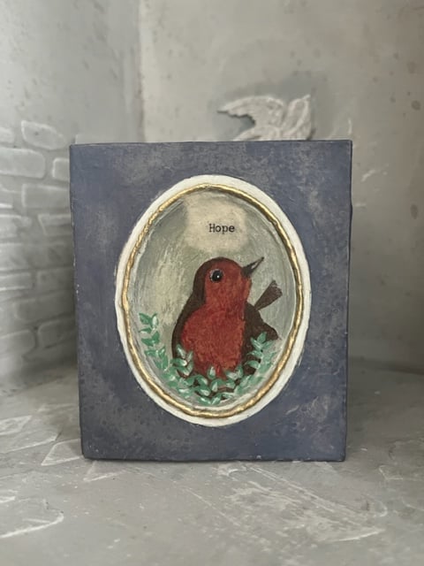 The box is handmade from recycled cardboard and paper, and incorporates a string frame, highlighted with gold gilding paste, featuring a hand painted robin, and the word ‘Hope’ typed onto Lokta paper using my grandma’s antique Royal typewriter.