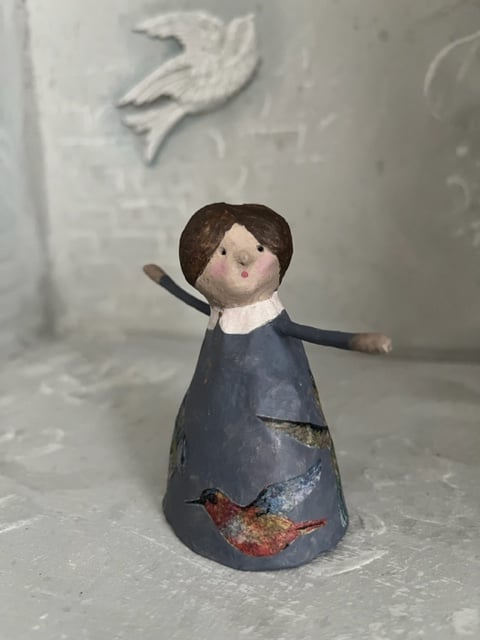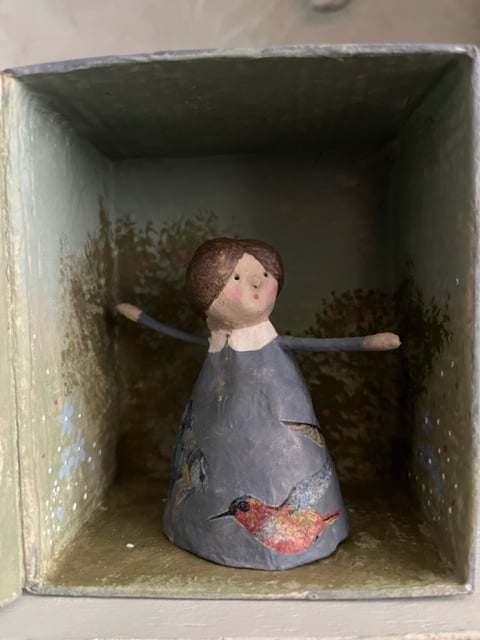 A paper diorama featuring a mini Emily Dickinson art doll in her garden - she is moulded from tin foil, florist wire, and layers of gluey paper; her dress is the colour of old violet, decoupaged with napkin birds.