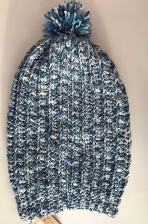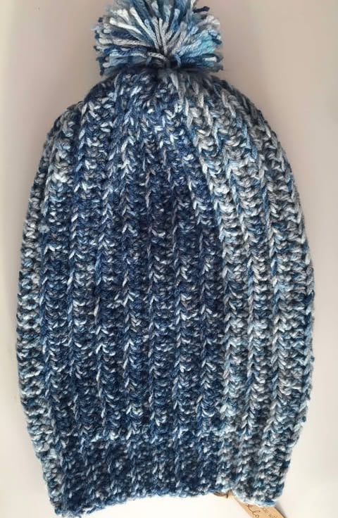Handmade crocheted ribbed hat, hard wearing. Stretchable due to crocheted pattern and acrylic yarn.