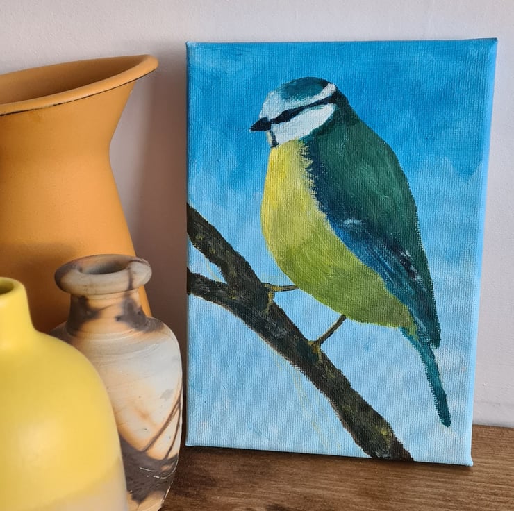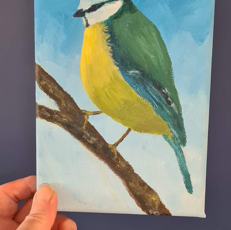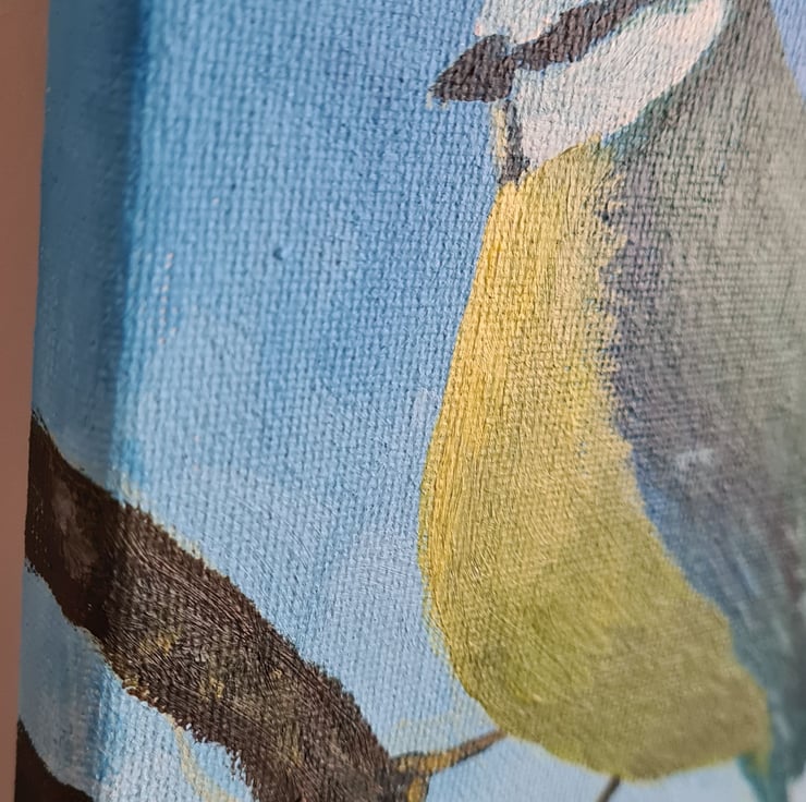 This is an original painting of a blue tit with a sky blue background, which I have painted with acrylics on canvas - also painted around the edges. I have signed it on the back with acrylic pen, and it has a layer of matt varnish to protect the paint.