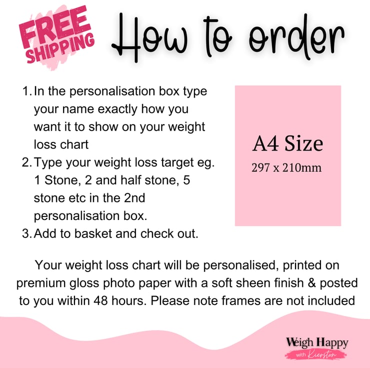 Ordering couldn’t be easier. Simply add your personalisation details. Once I’ve received your order, I will print your weight loss chart in my home workshop in the West Midlands, designing and adding the personalisation as requested. Your weight loss chart will be printed on premium gloss photo paper with a soft sheen finish & posted to you within 48 hours.
