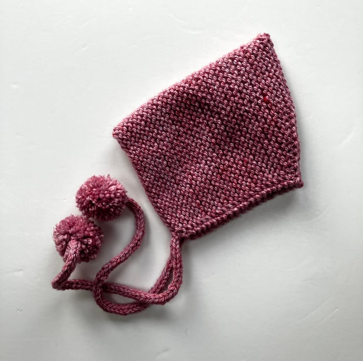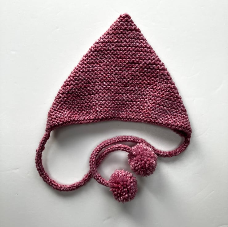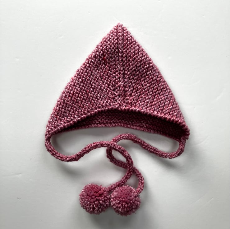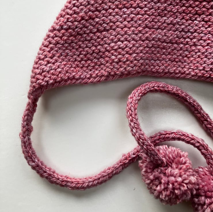 It’s knitted in garter stitch for texture and ties under the chin with knitted cords which are finished with pompoms.