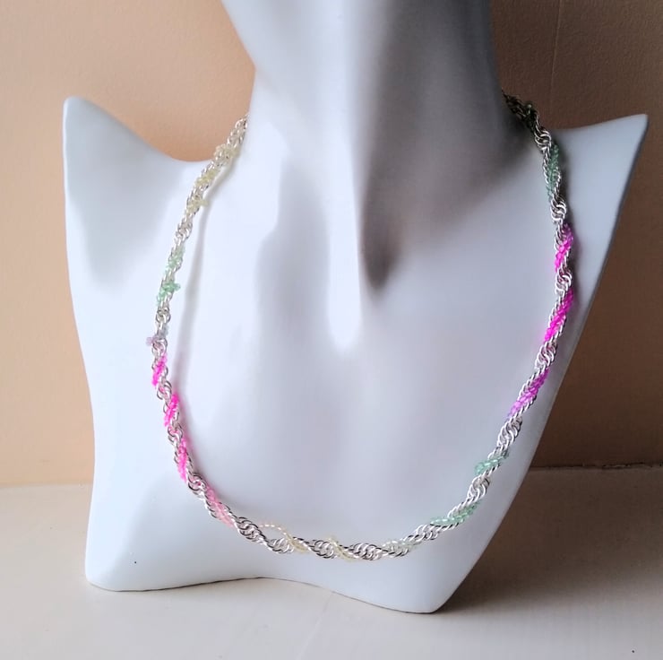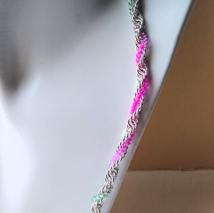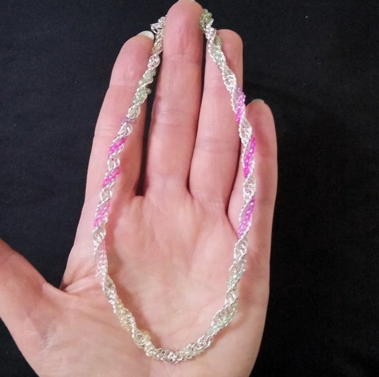 A multicoloured crystal and silver plate twisted ,handmade chainmaille, link necklace. A minimalist chain necklace with just a sprinkling of tiny faceted ombre pastel crystal beads, of lemon and mint through to fuchsia pink.