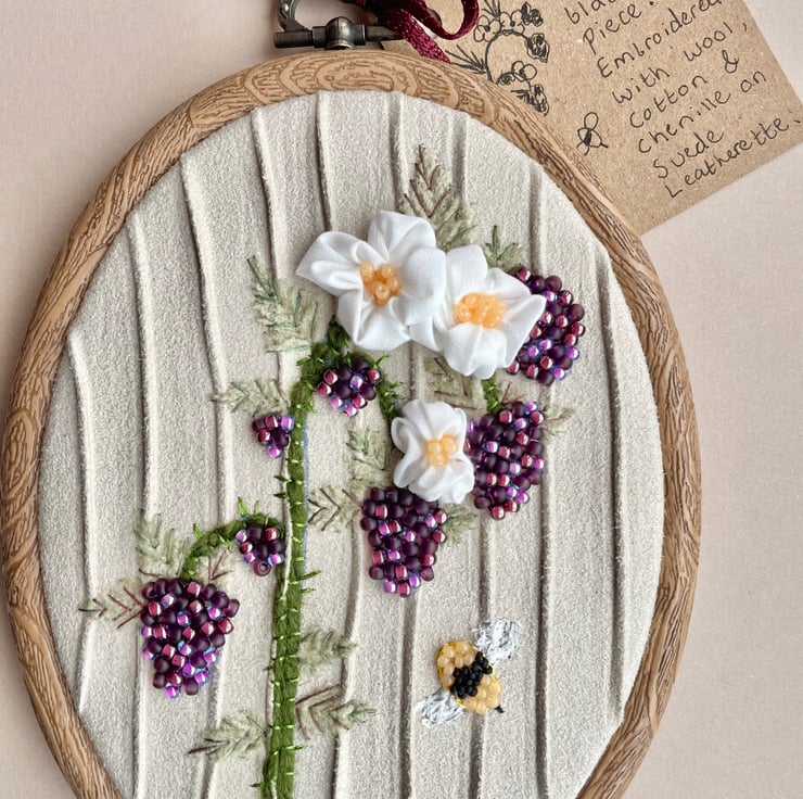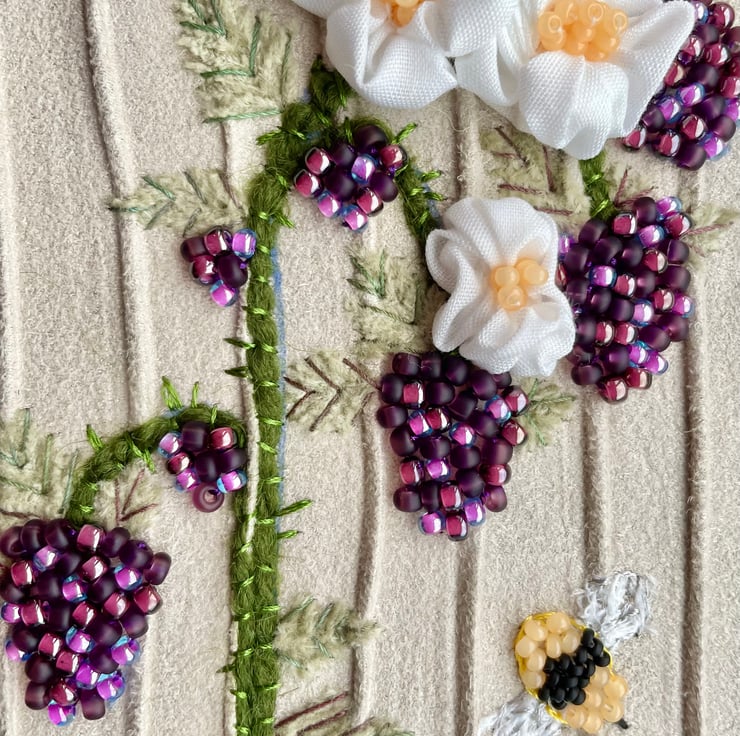 This is a small hand embroidered wall art piece with beaded blackberries and fabric manipulated fruit flowers.