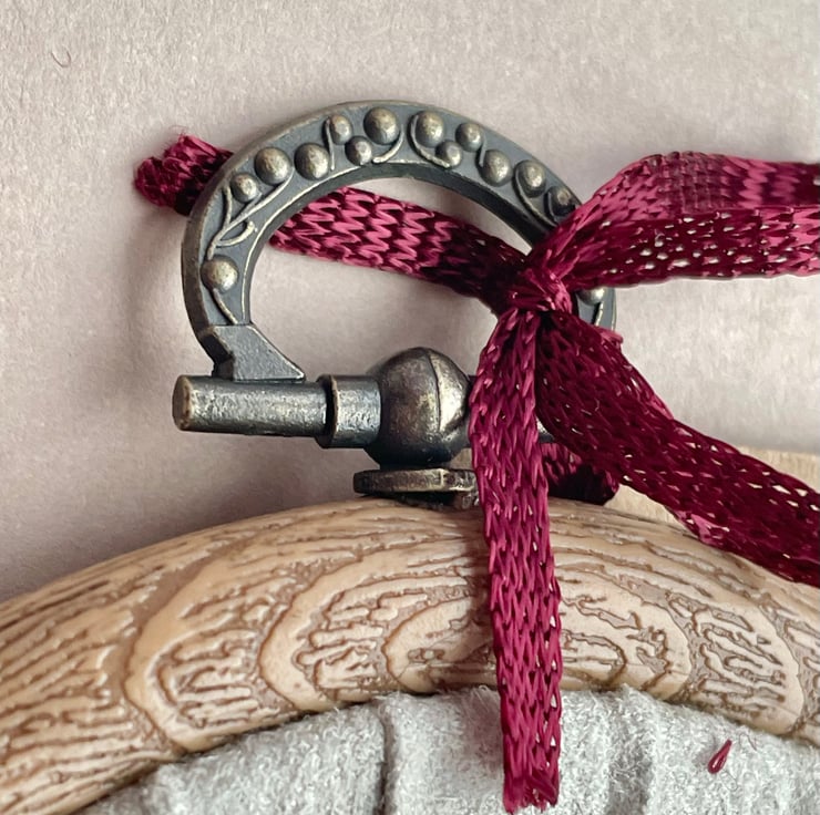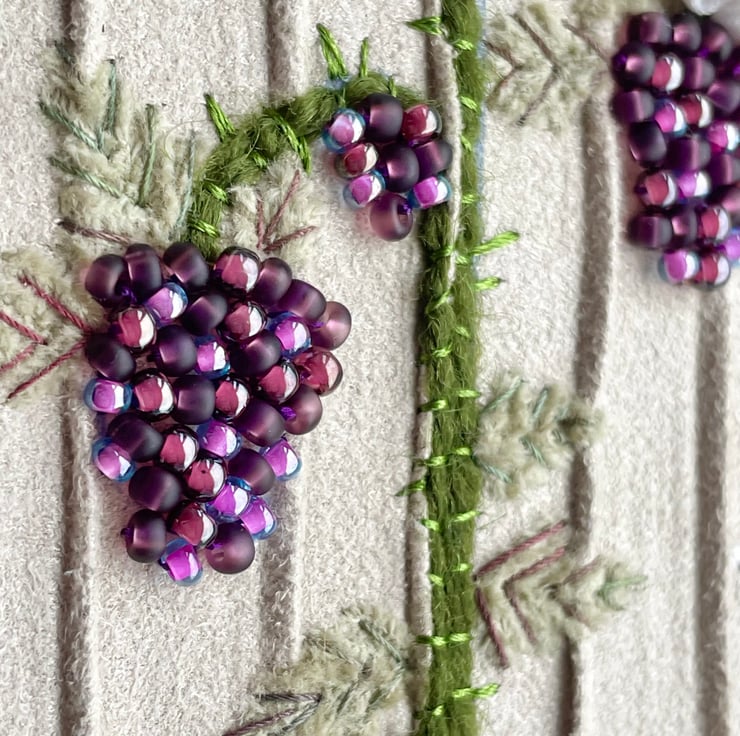 It has all been hand sewn onto a suade embossed textured leatherette. With hand couched woolen stems and satin stitched leaves.