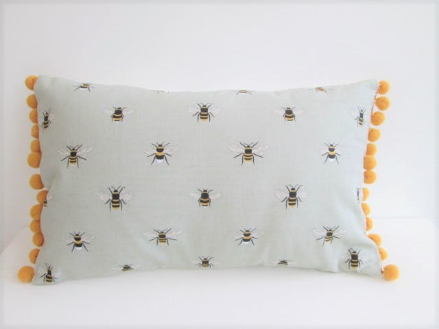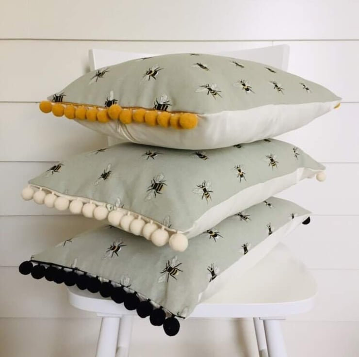 Sophie Allport bees fabric cushion with cream back and central zip and mustard pom poms
