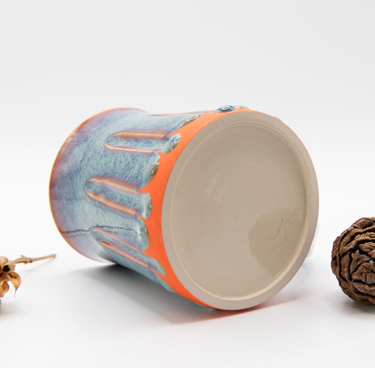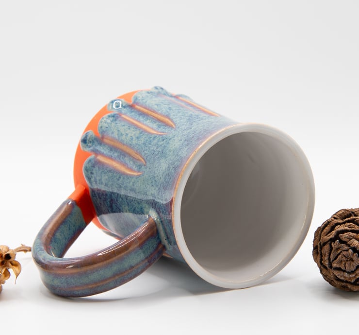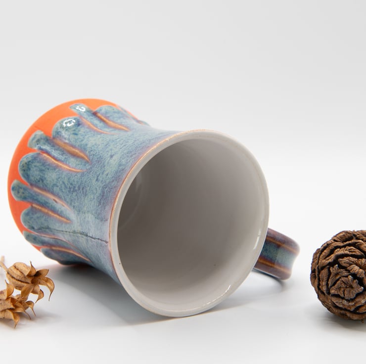Finished with a white gloss liner and outside the lower part is velvet flame orange and the upper part has a combination of glazes giving a blue flecked finsh which breaks orange/amber over the carving.