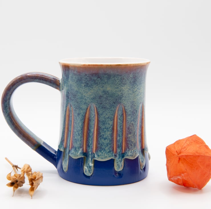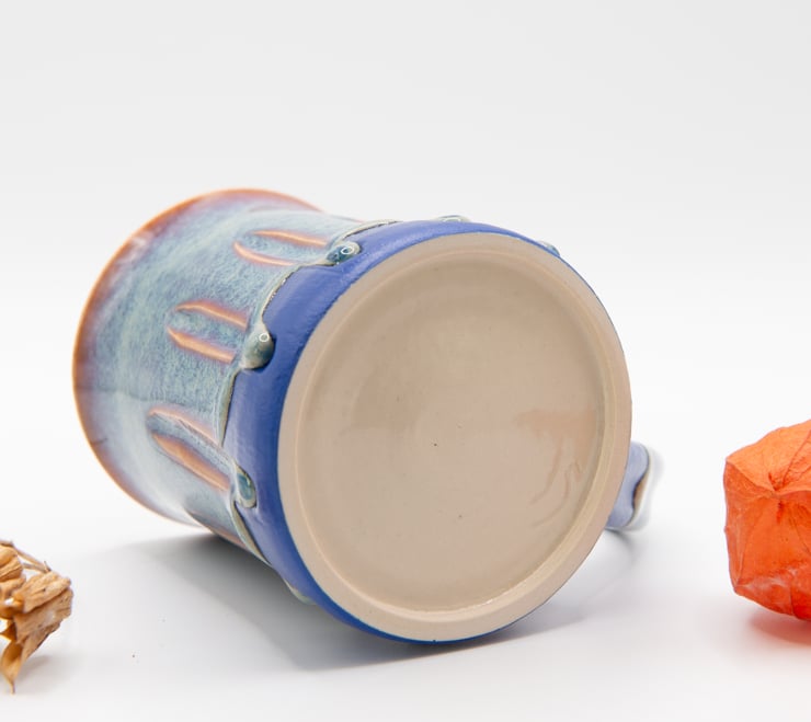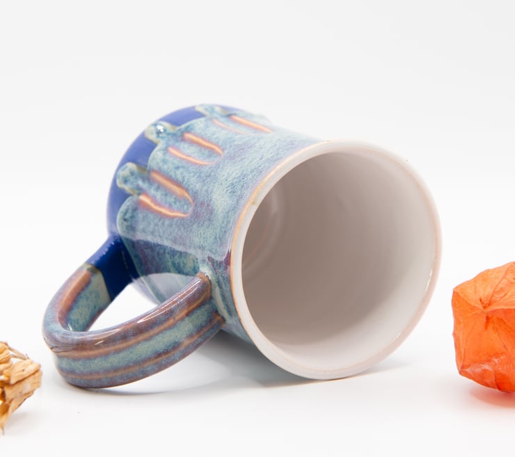 Finished with a white gloss liner and outside the lower part is velvet electric blue and the upper part has a combination of glazes giving a blue flecked finsh which breaks orange/amber over the carving.