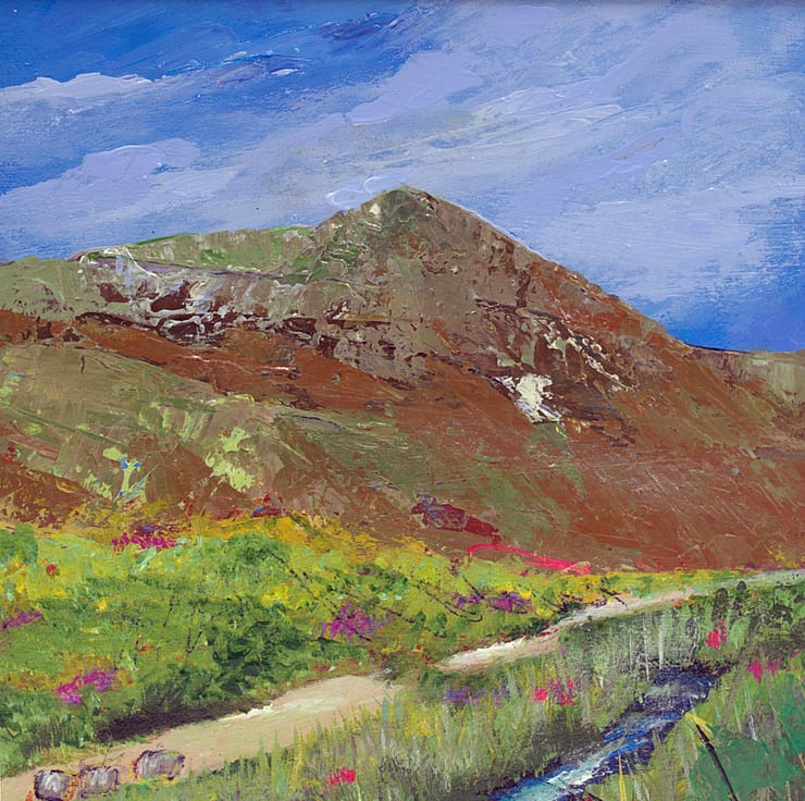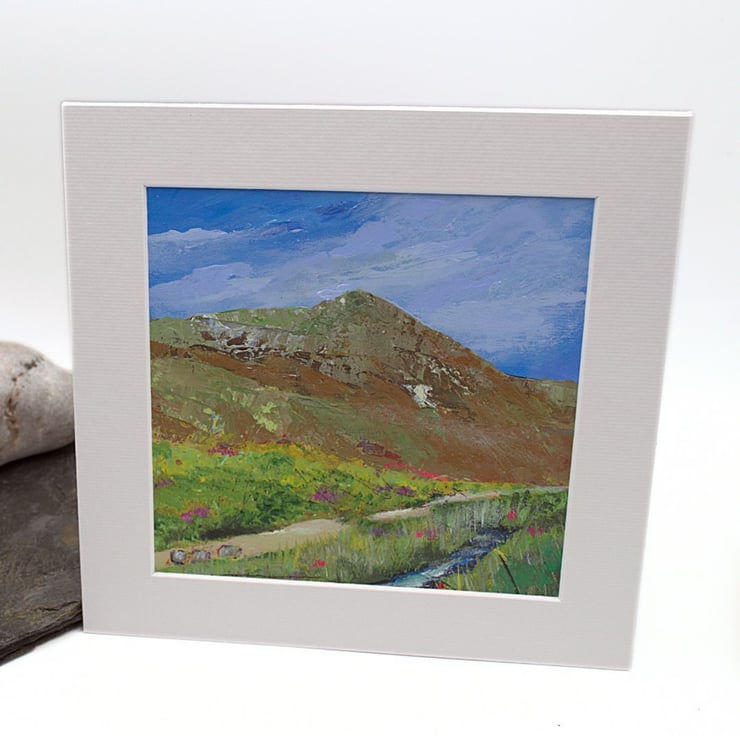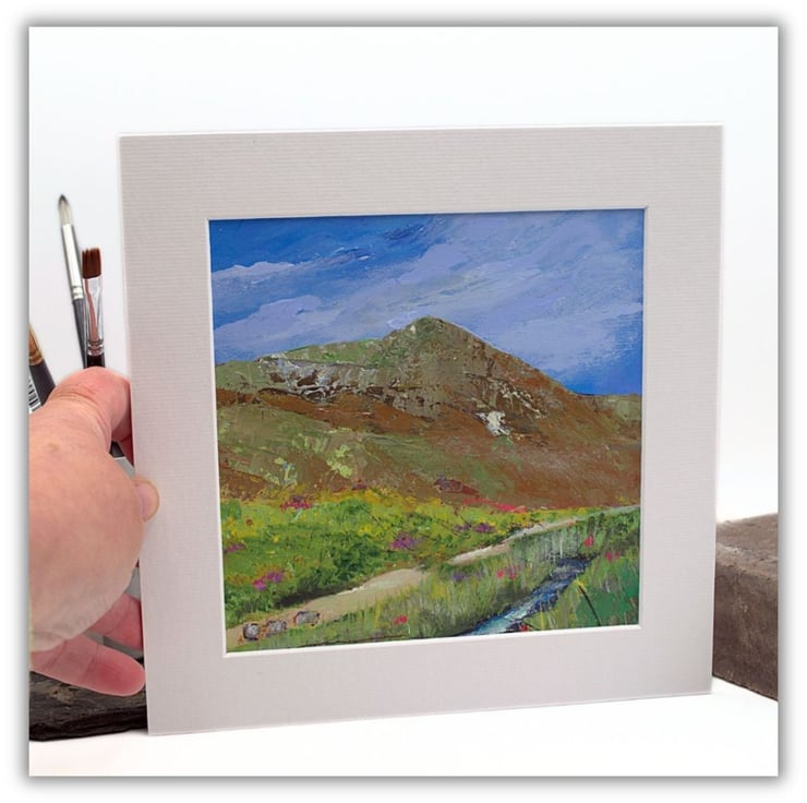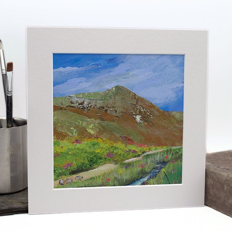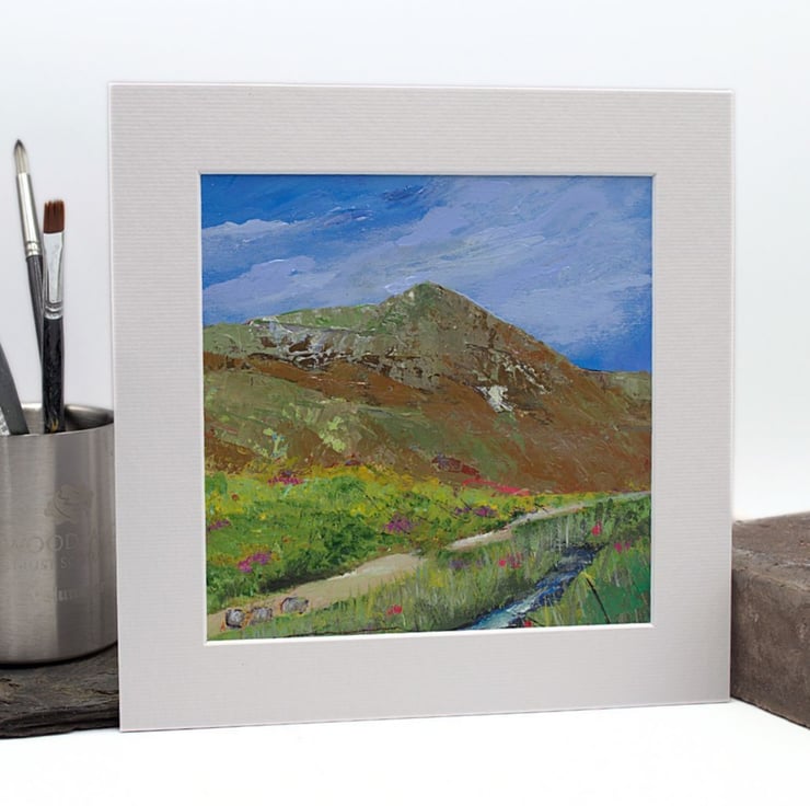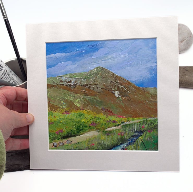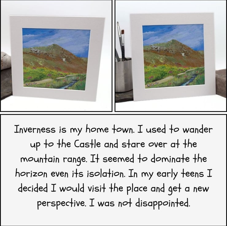 This is a small original artwork of a Scottish mountain. The mountain is Ben Wyvis which rests in the north of Scotland in the Highland region. The sky is a light blue with wisps of clouds brushing over the summit. There is a path that will take visitors to the start of the climb and the wee river offers a place to rest and cool off. I have used professional-quality acrylics on sealed paper. I've used flat brushes to paint the sky and knives to outline the Ben. By using painting knives, I've been able to layer the paint and scratch in to the layers.