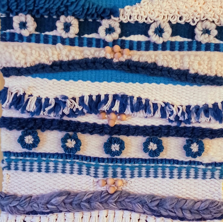 I love creating quality handwoven wall hangings and have several different sized table looms, so I can make a variety of sizes depending on the subject. There is something about the colours and textures of the different yarns available that really inspires me, and considering how to apply them to a composition is such fun. I take inspiration from the places I've visited, my garden and nature generally. Sometimes I also add additional handmade yarn flowers, beads, lace and ribbons to these hangings to add more texture and use embroidery for further detail.