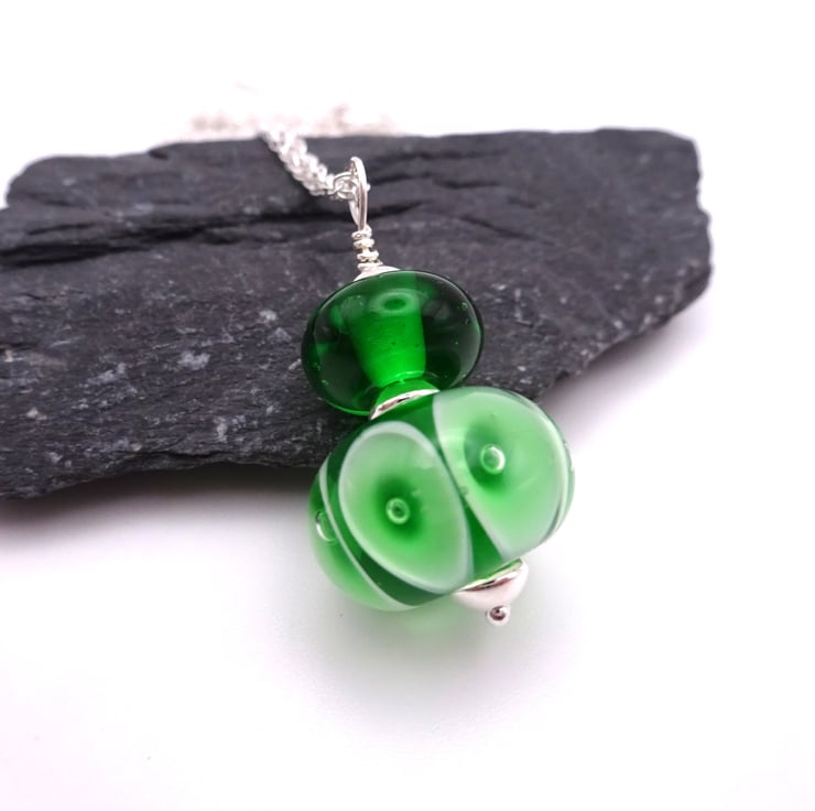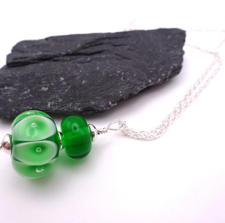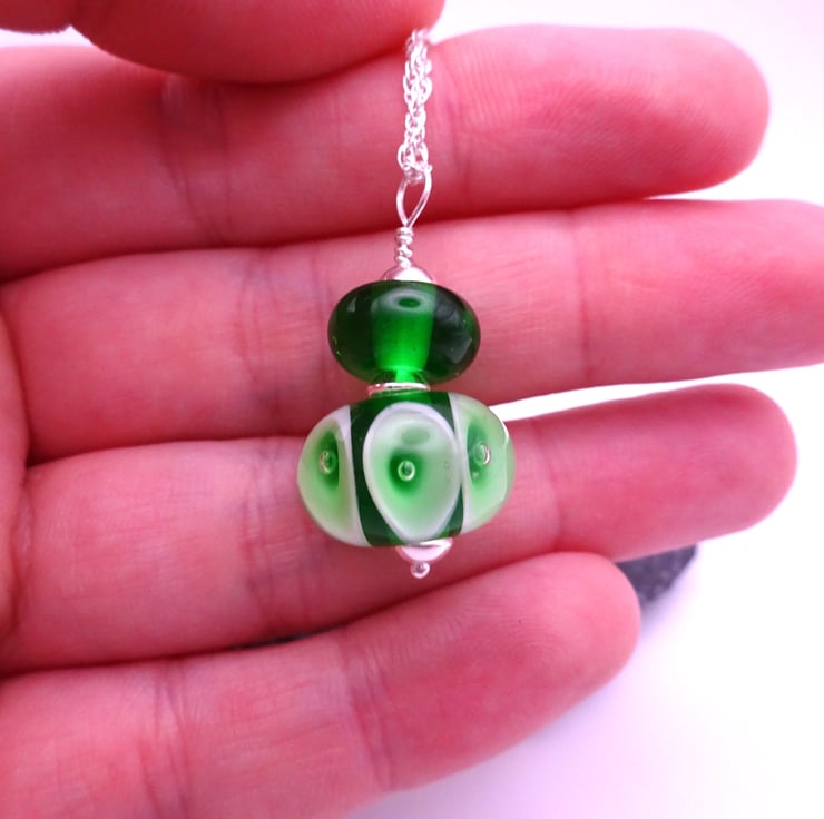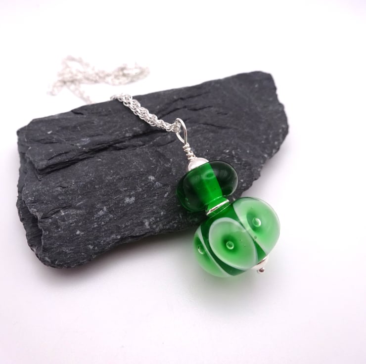 A sterling silver chain featuring a handmade lampwork glass pendant.
