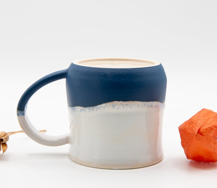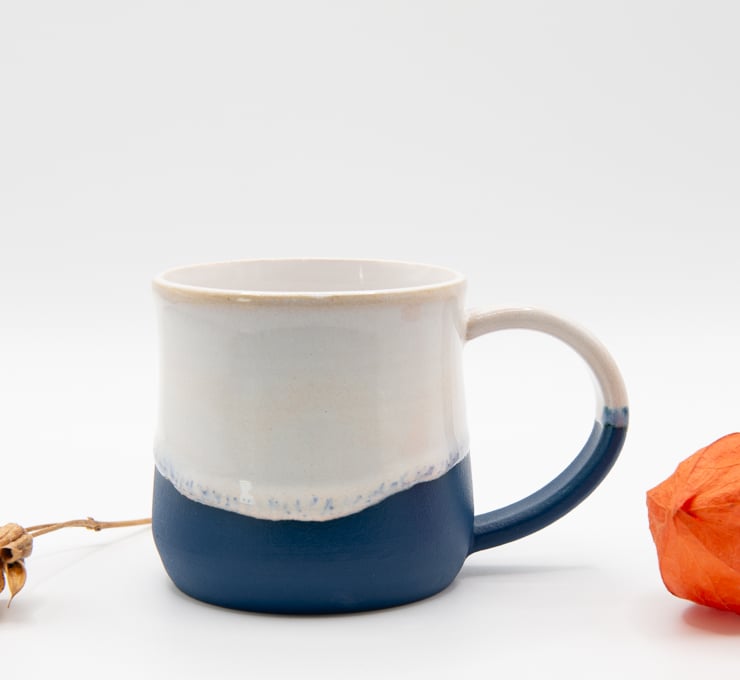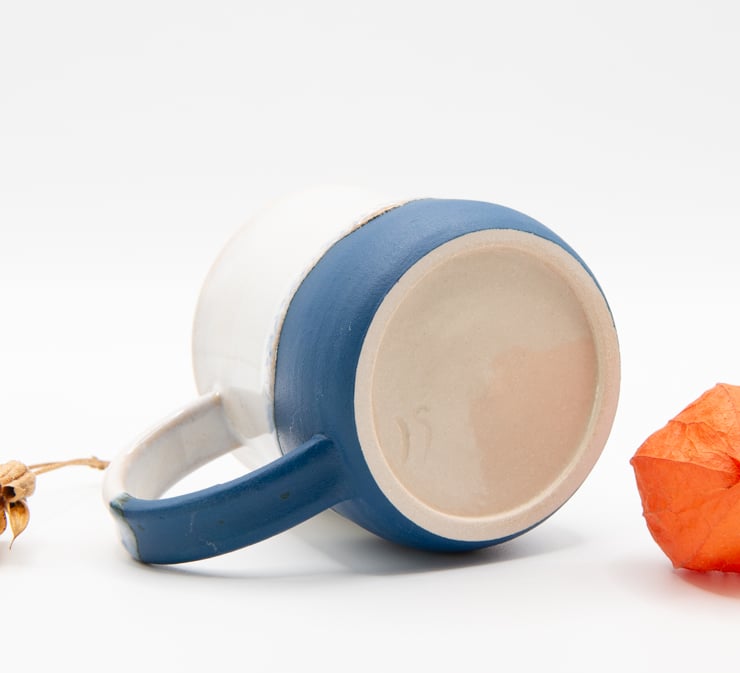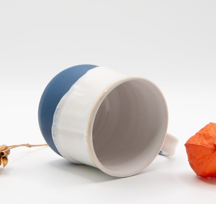 Finished with a white gloss liner and outside a combination of Teal Blue velvet underglaze at the base with Honey Flux glaze above and overlapping.