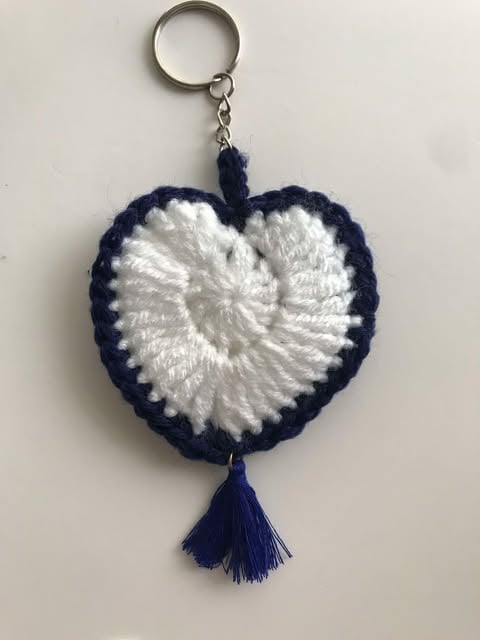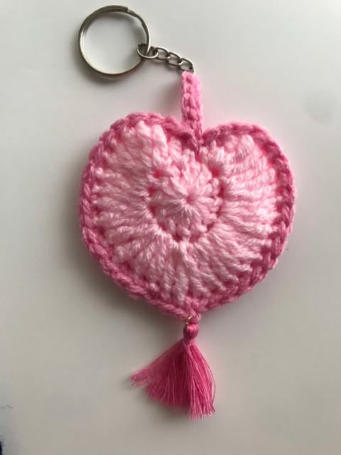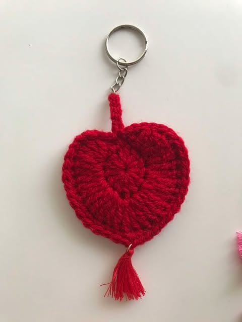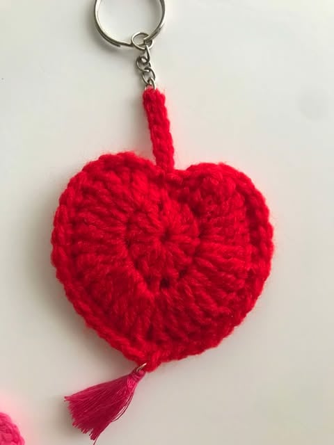Handmade crochet heart keychain available in various colors with a small tassel attached for design.