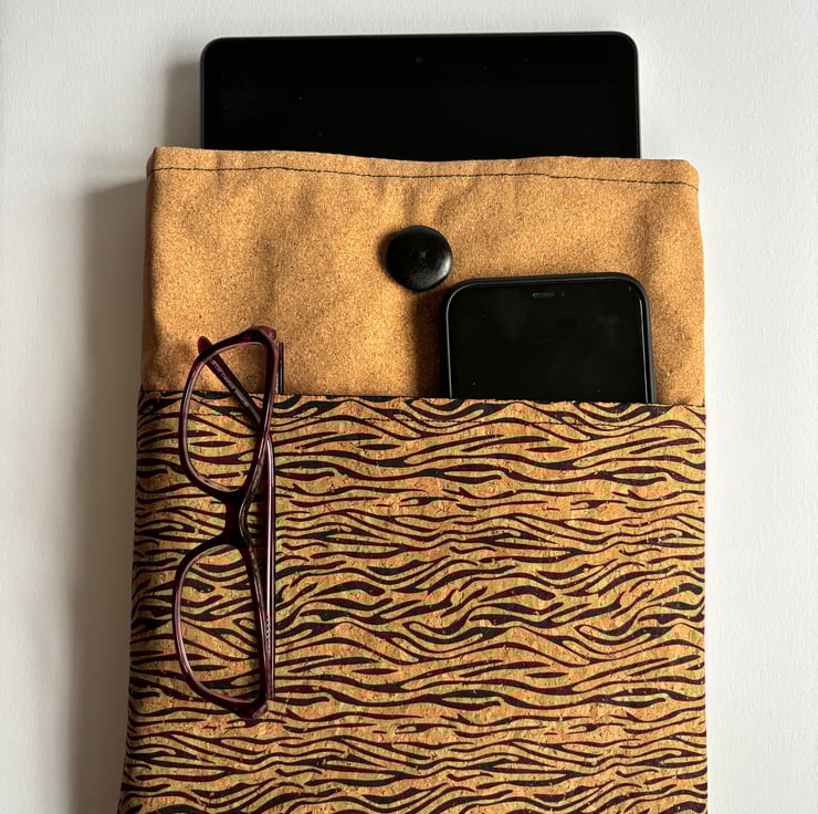 Tiger print Cork fabric iPad / Tablet/bookcase with pocket for phone, glasses, and much more.