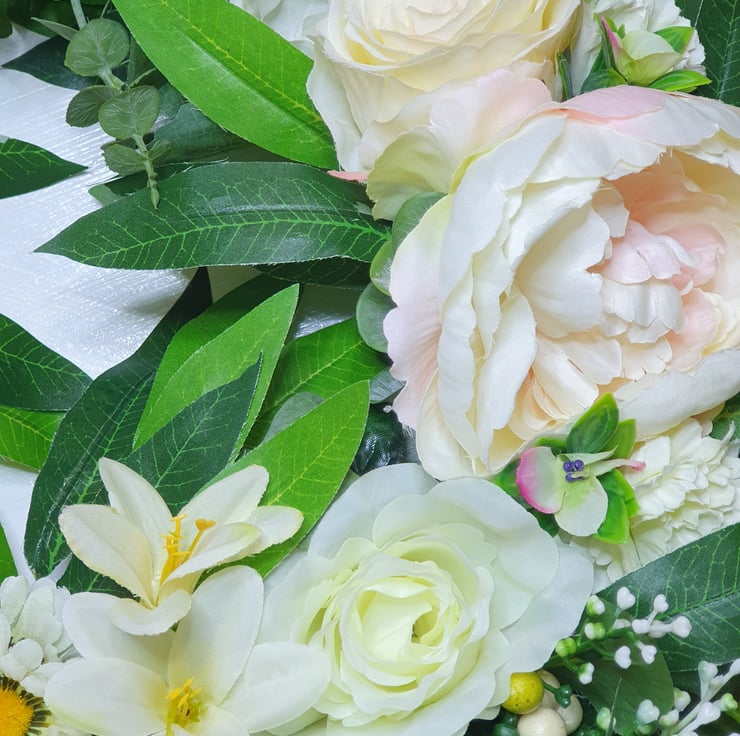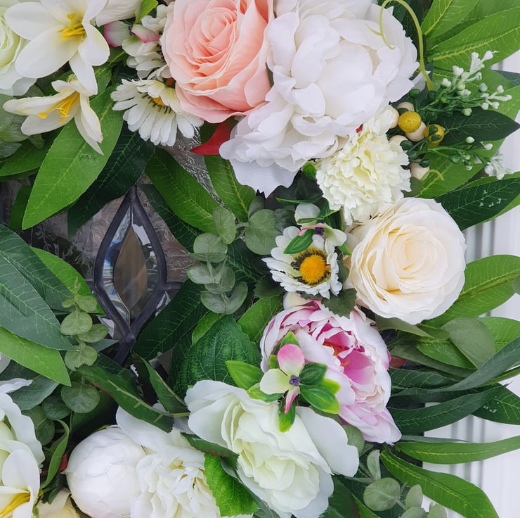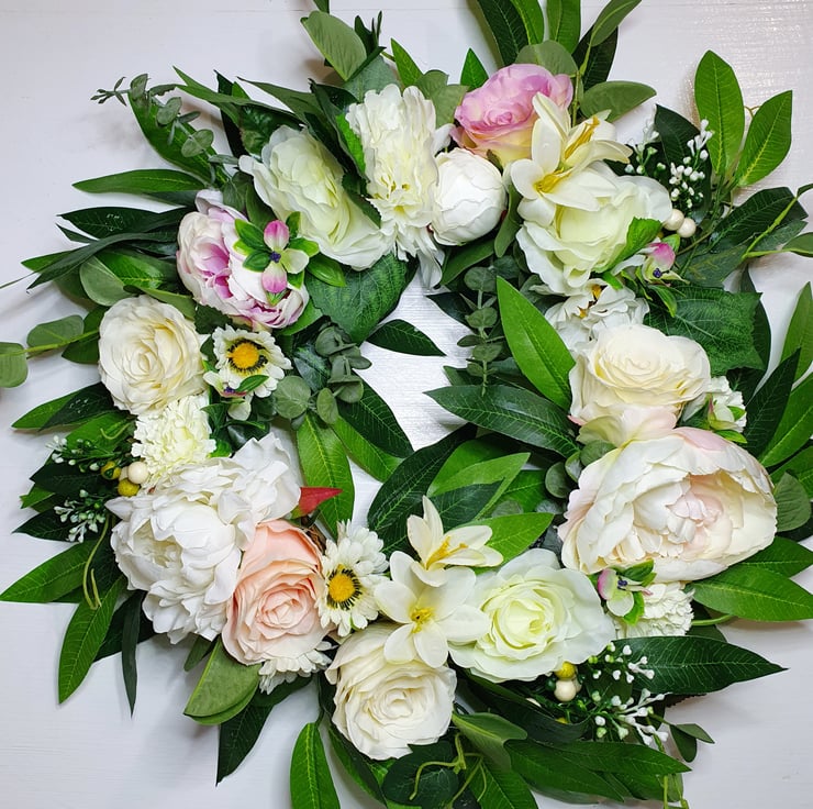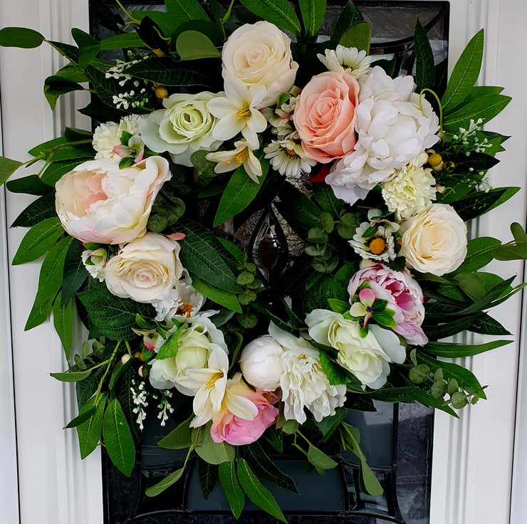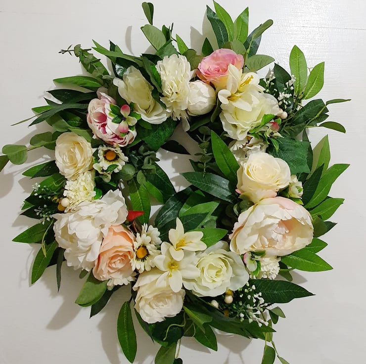 A gorgeous Artificial floral Wreath. In soft colours of pale pink. Cream white and apricot. Secured on a natural grapevine Wreath. With peonies roses and a mixture of flowers and foliage. Grapevine 30cm. Wreath 60cm. One of a kind. Beautiful and everlasting. Perfect for your own home or as a beautiful unique gift.