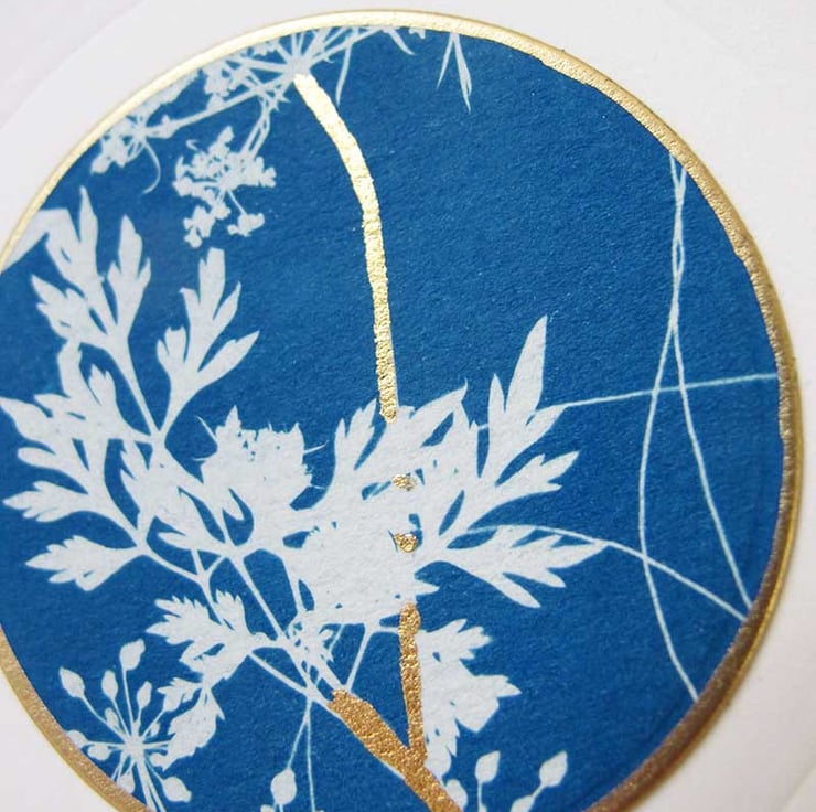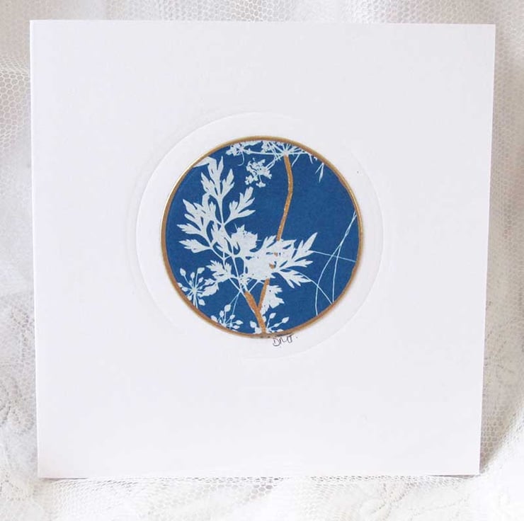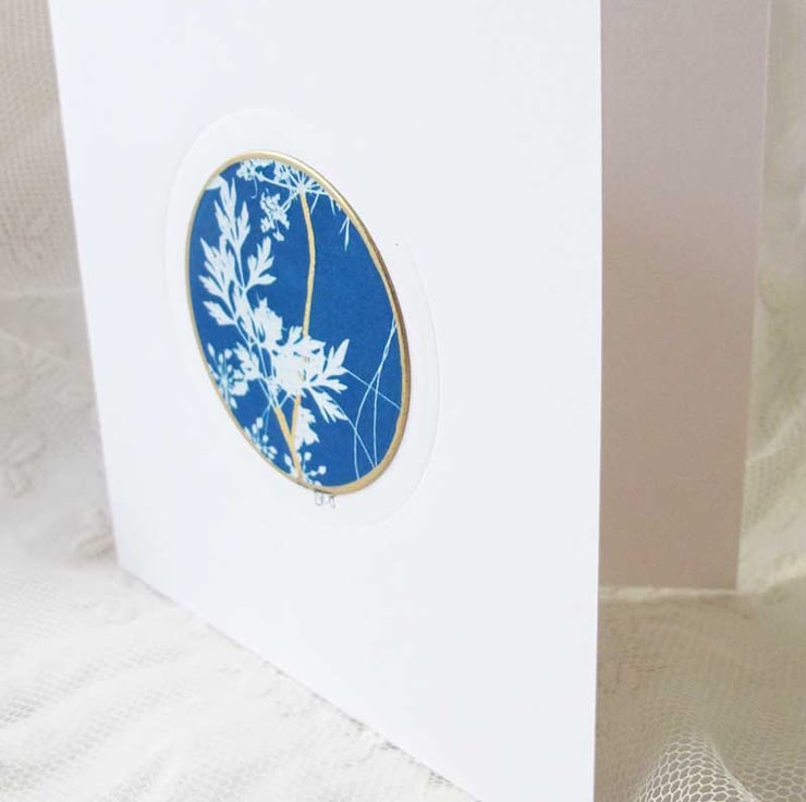 A beautiful card made from an original and unique cyanotype print, edged with 18ct gold leafing and highlighted with genuine 24ct gold leaf. This delicate print has been made using the cyanotype process and is in a lovely rich shade of dark blue with a crisp white botanical image - perfect for a special occasion or perhaps framing it as it is. The print has been mounted on a good quality card base, and been hand embossed to create a frame around the print. The card has been left blank for your own message.