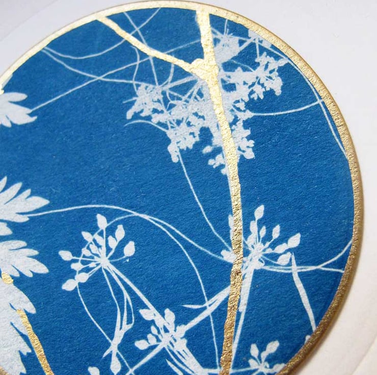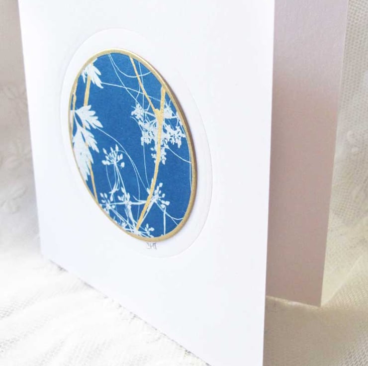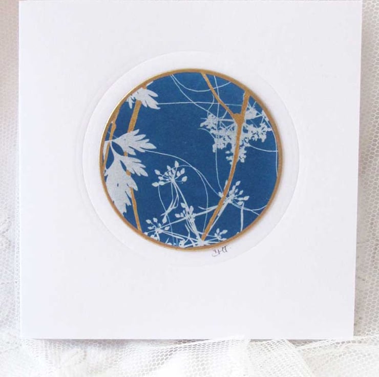 A beautiful card made from an original and unique cyanotype print, edged with 18ct gold leafing and highlighted with genuine 24ct gold leaf. This delicate print has been made using the cyanotype process and is in a lovely rich shade of dark blue with a crisp white botanical image - perfect for a special occasion or perhaps framing it as it is. The print has been mounted on a good quality card base, and been hand embossed to create a frame around the print. The card has been left blank for your own message.